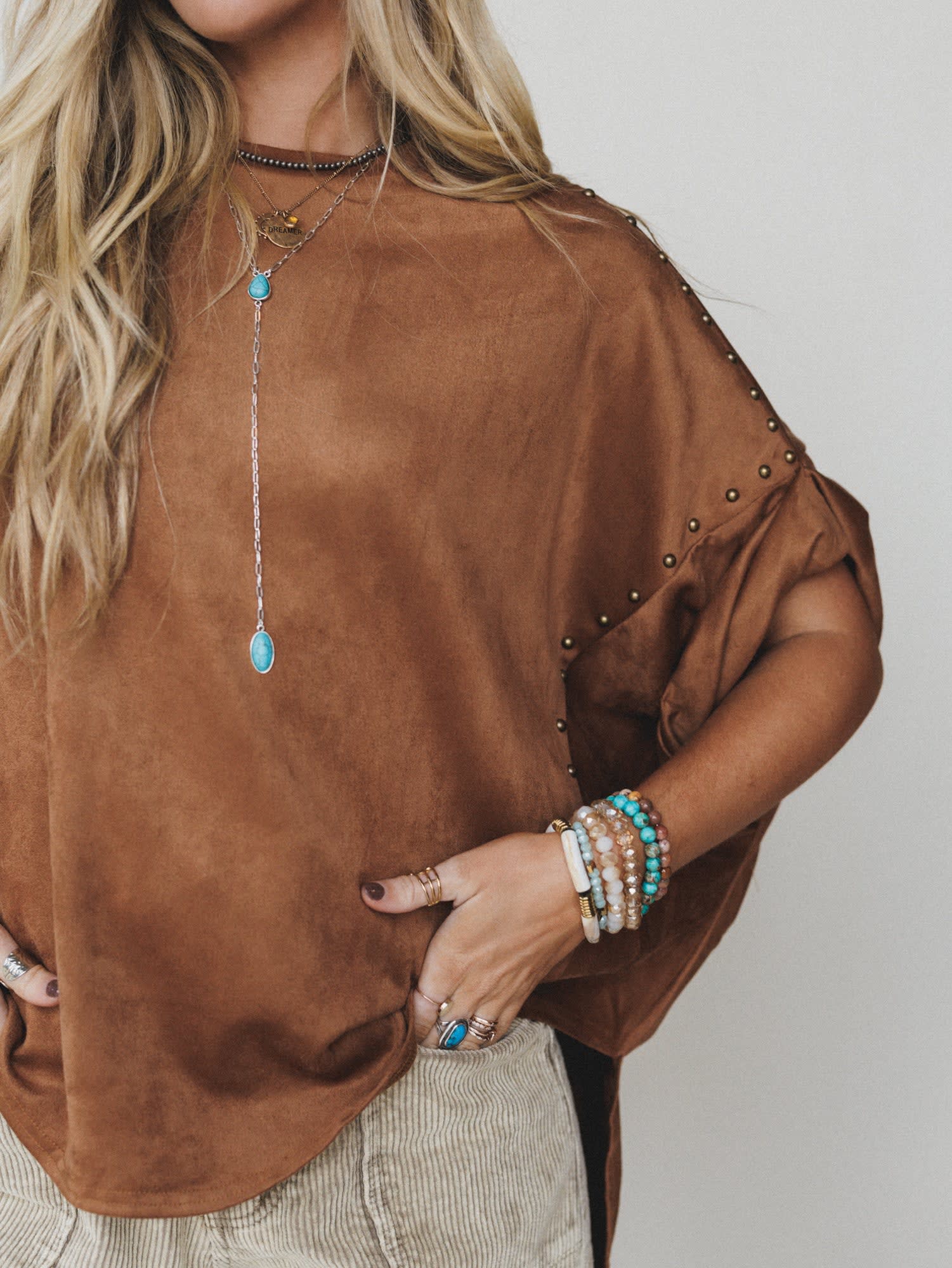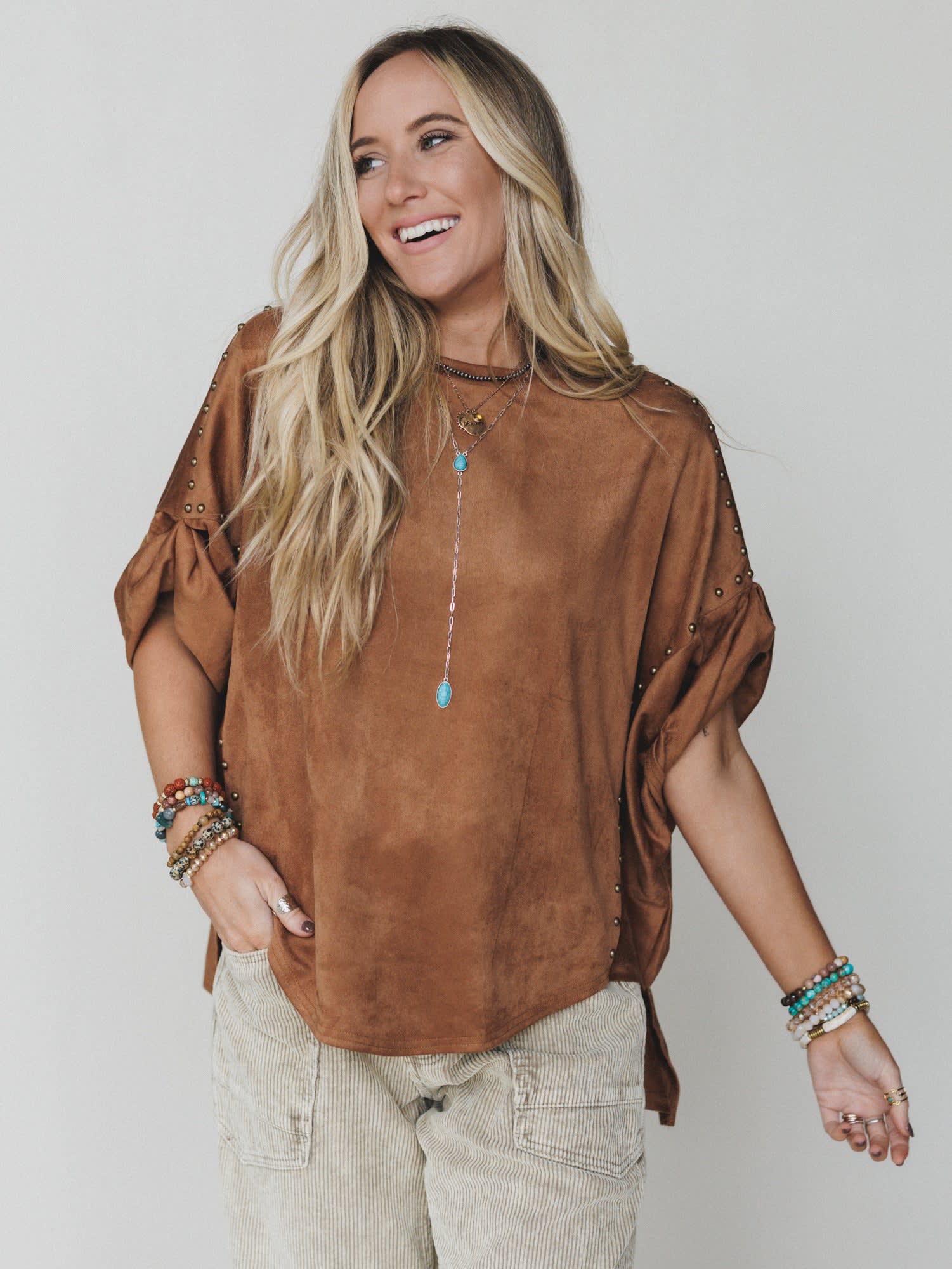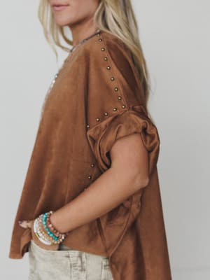 Your go-to boho top just got a warm-weather upgrade. The Tomcat Studded High Low Top in Camel is effortlessly luxe with its soft suede-like finish and desert-inspired hue. Gold studs trace the shoulder seams for a subtle glint that catches the light with every move. This is the kind of piece you’ll throw on for brunch and end up dancing in under the stars.