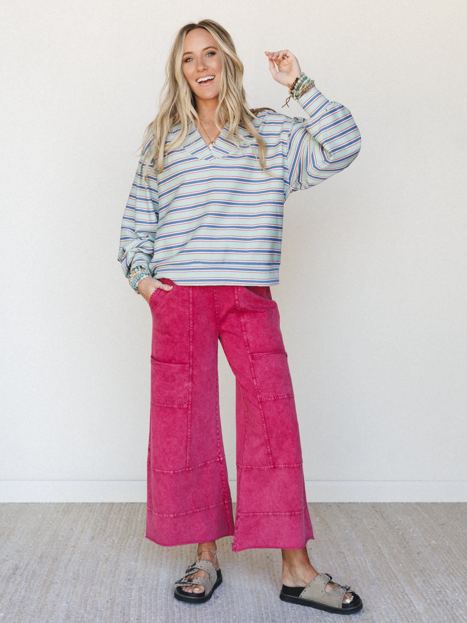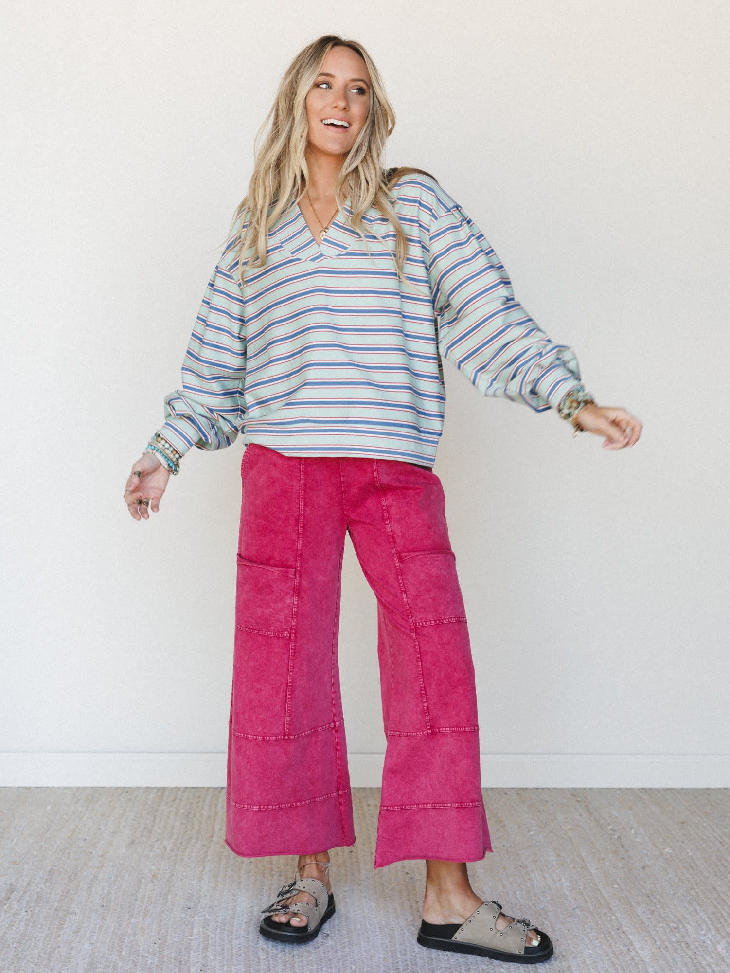 When you're wondering what to wear on a road trip that feels effortlessly put-together, this boho chic bundle delivers the perfect combination of comfort and free-spirited style. The stripe shirt pairs beautifully with these boho wide leg pants to create an outfit that transitions seamlessly from casual coffee runs to weekend adventures.