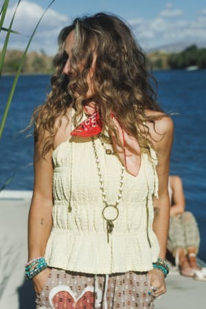 - Wear this yellow halter top with light wash bell bottom jeans and booties for a festival-ready look.