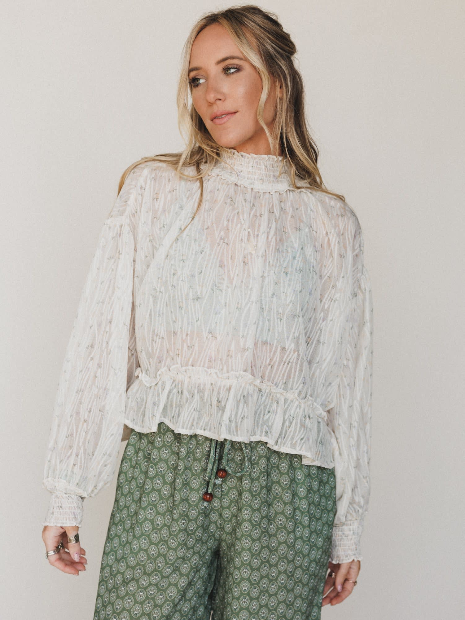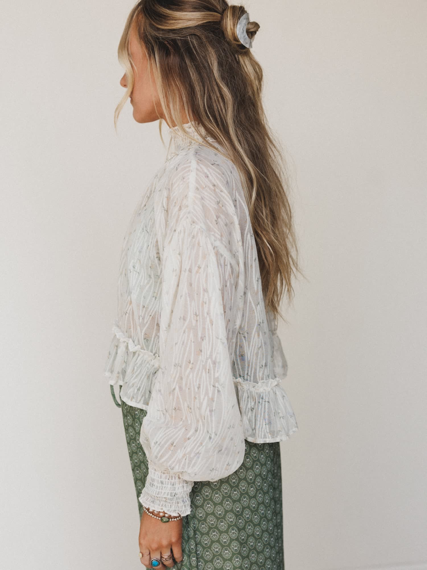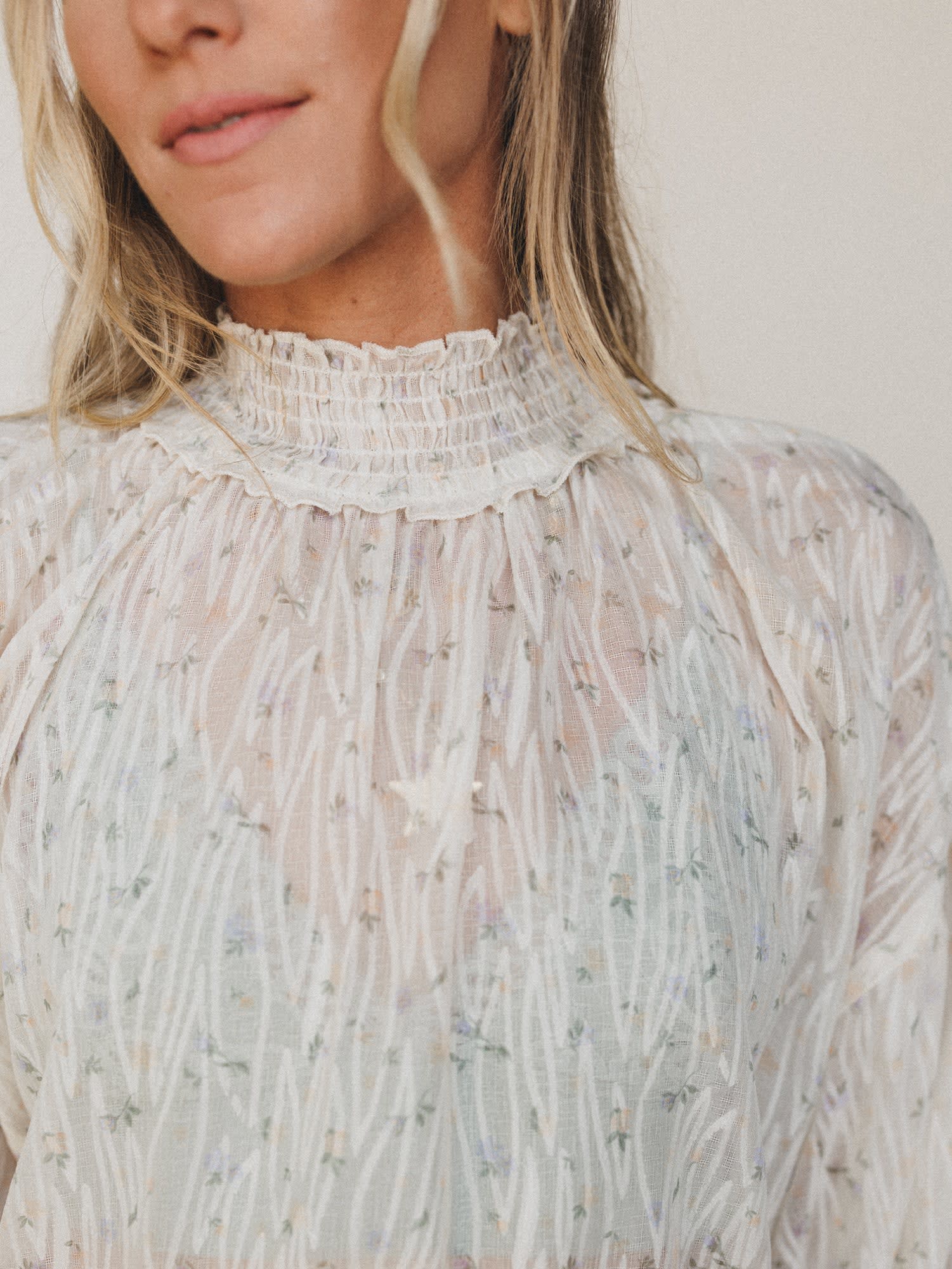 - Airy sheer blouse with soft volume, a high neckline, and romantic flow