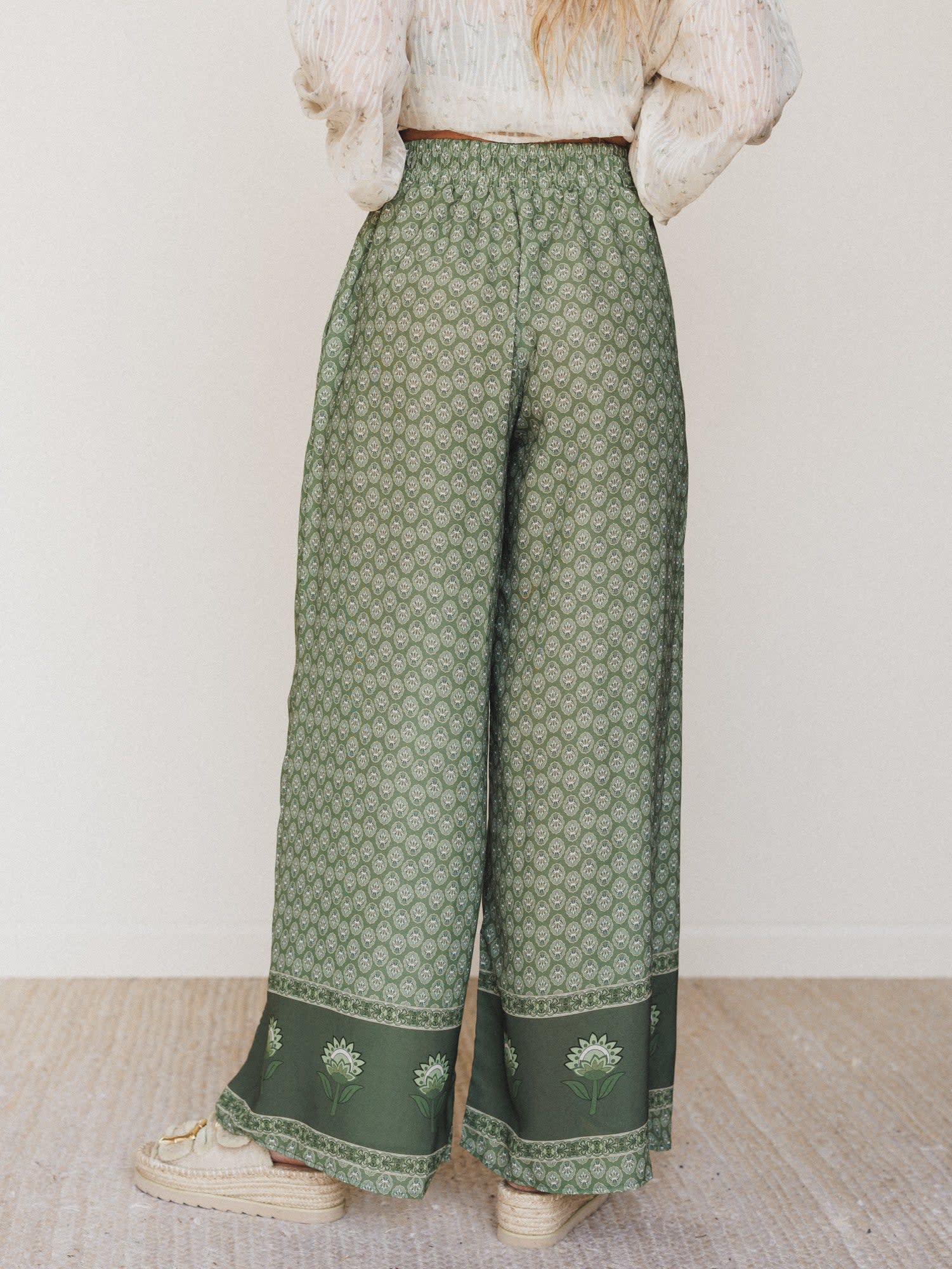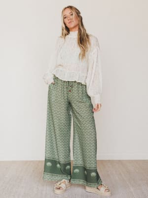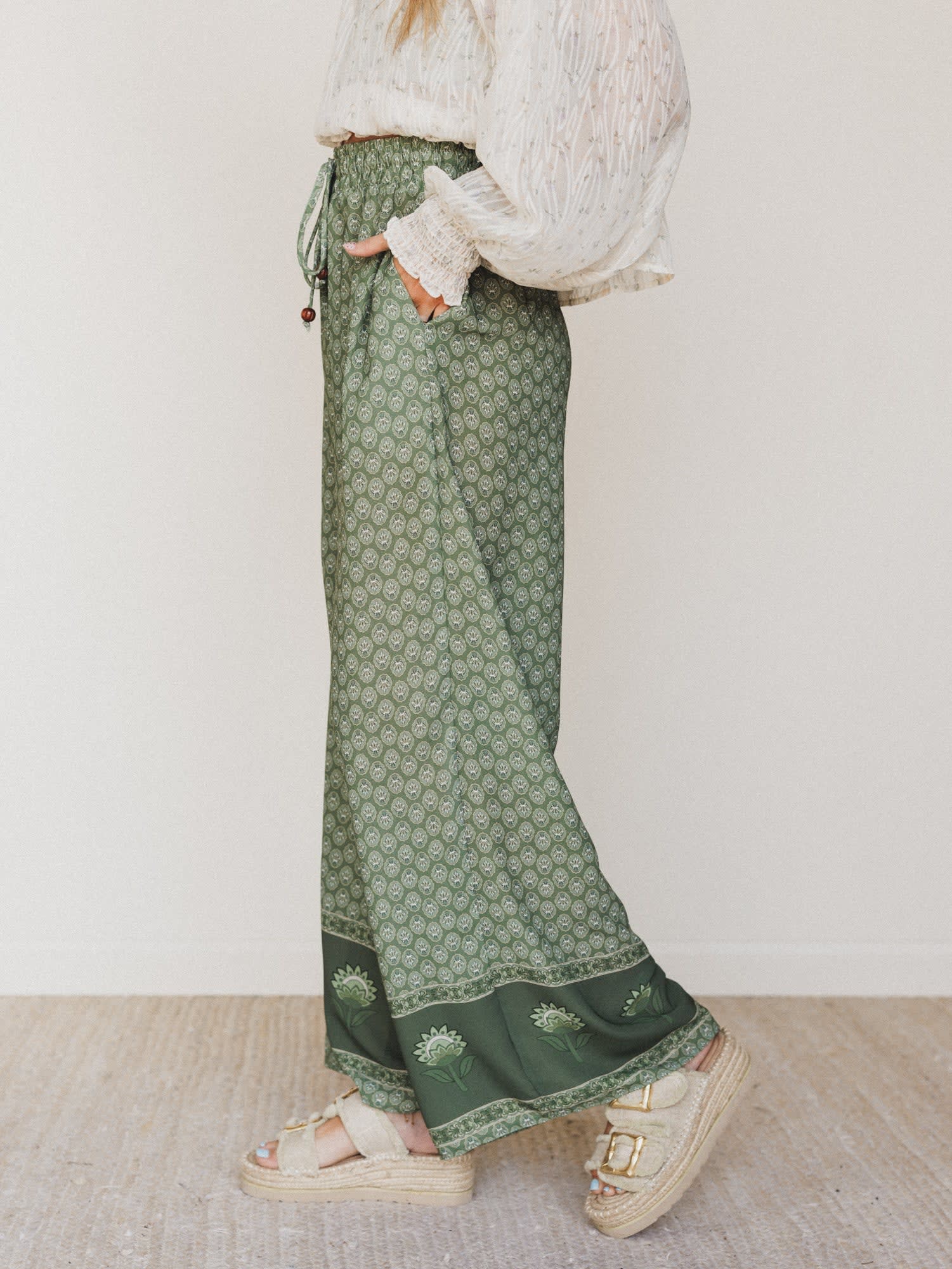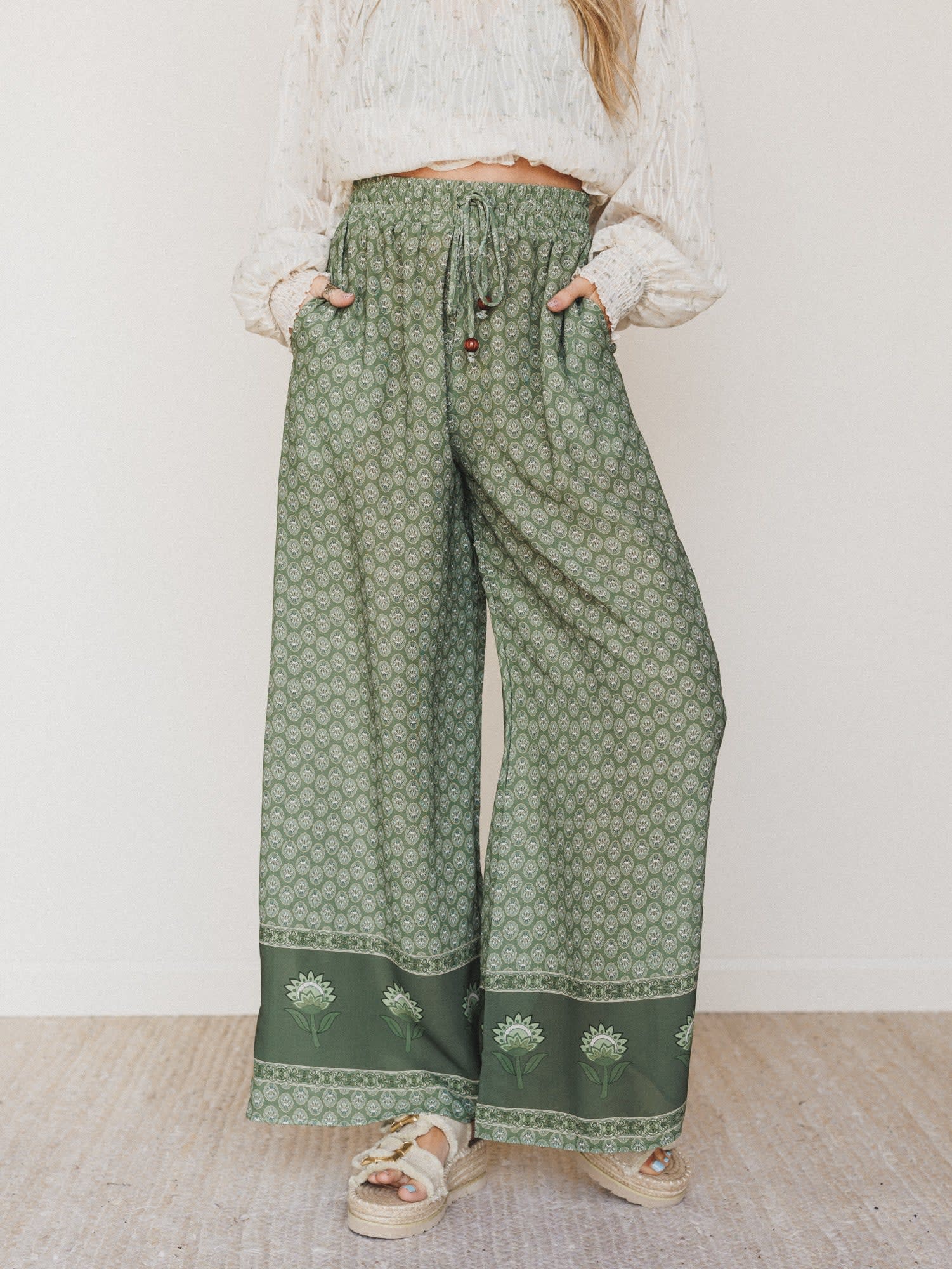 - Lightweight printed pants with an elastic drawstring waist and easy wide-leg fit