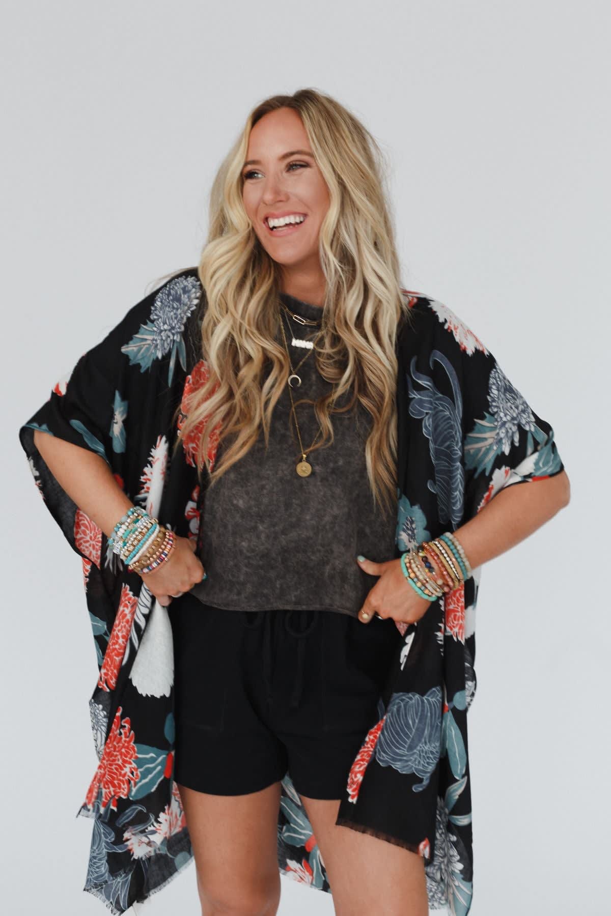 Your go-to for what to wear over a simple tee and shorts when you still want to feel styled. This floral kimono instantly elevates your everyday look and doubles as the perfect lightweight layer for a casual date night outfit or weekend brunch.