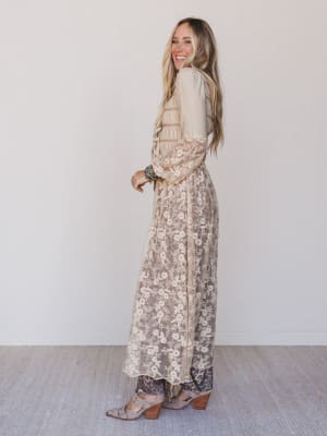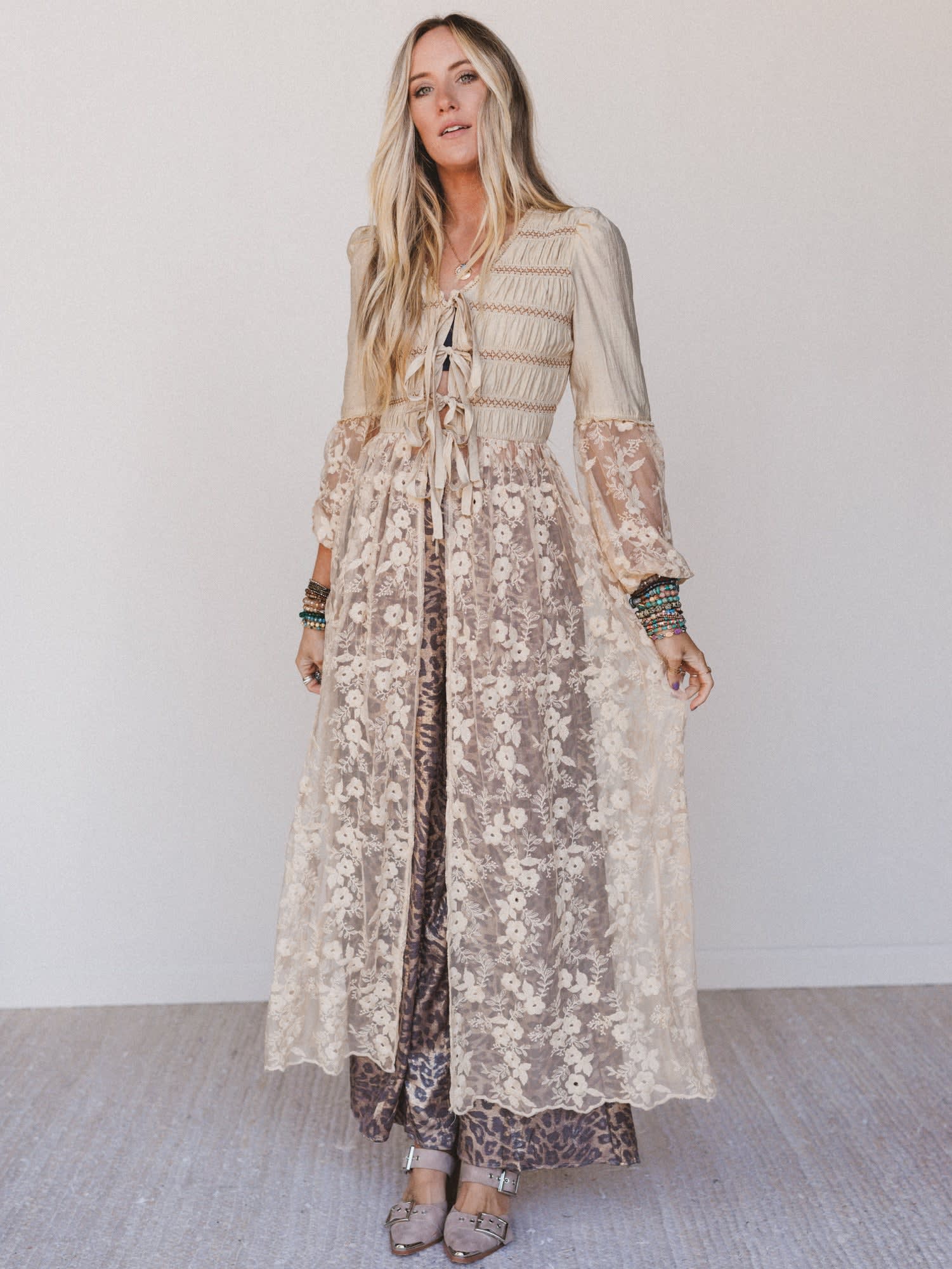 Float through your day in the ethereal elegance of the Untamed Muse Long Sleeve Duster. Delicate and daring, this sheer embroidered piece layers effortlessly over your favorite boho staples—from wild-printed flares to bralettes and boots.
