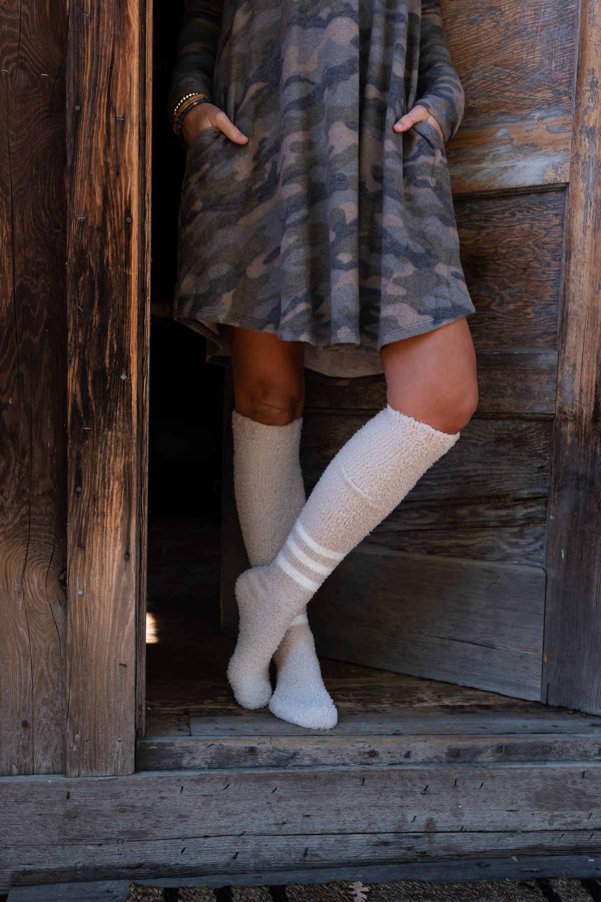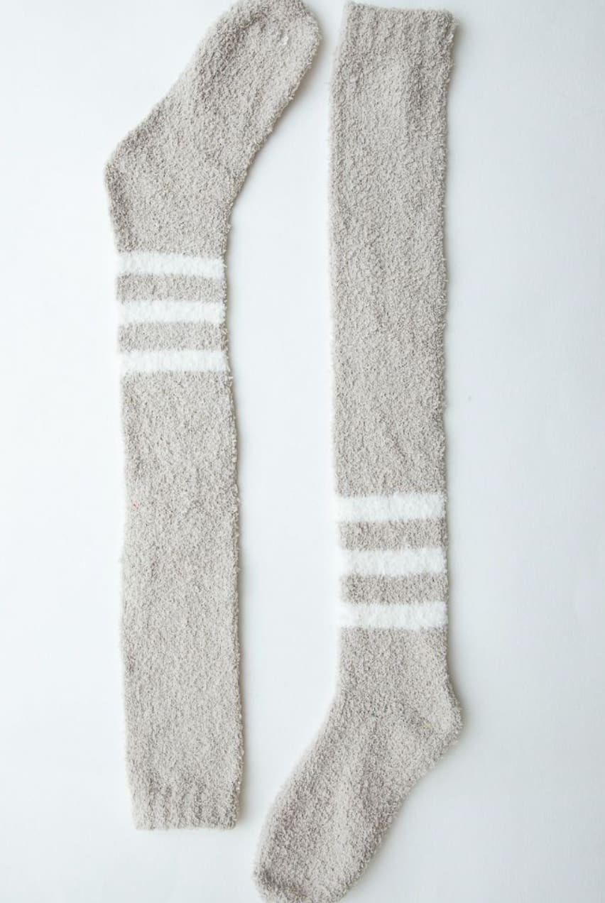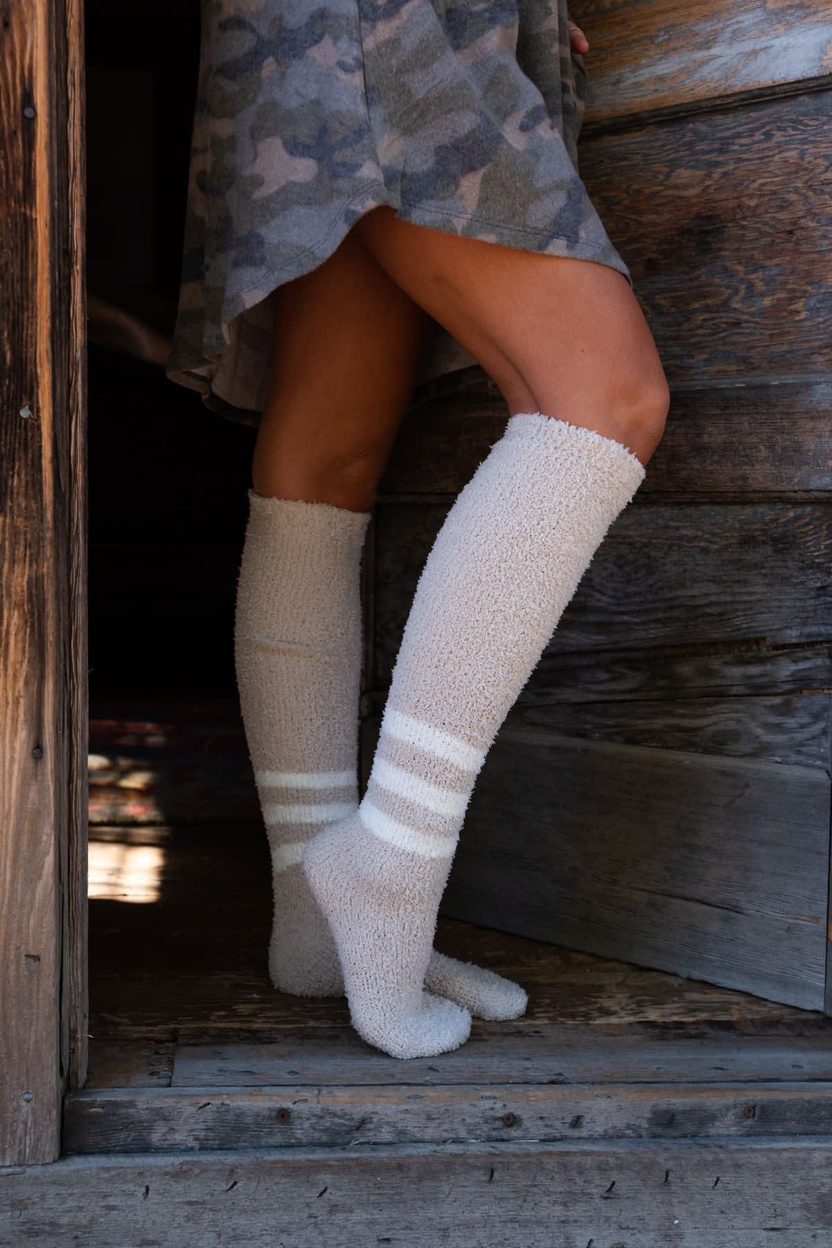 Stay cozy and warm all season long with the Varsity Strip Boucle Knee Socks! Made of the coziest fuzzy, stretch, knit fabric with cute stripe details around the ankle, you'll love to wear these around the house or under your boots.