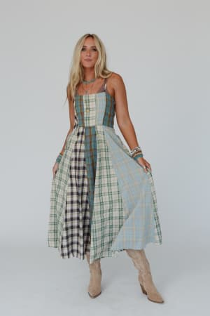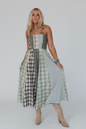 - Western Charm Checkered Dress: This patchwork plaid dress is a sweet mix of soft neutrals and classic western vibes—perfect for fall fairs, boot scootin’ nights, or spontaneous photo ops.