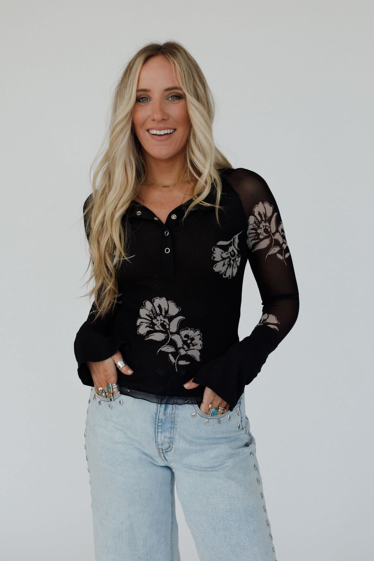 This unique black boho top looks amazing with wide leg jeans and platform sandals for a Y2K style look.