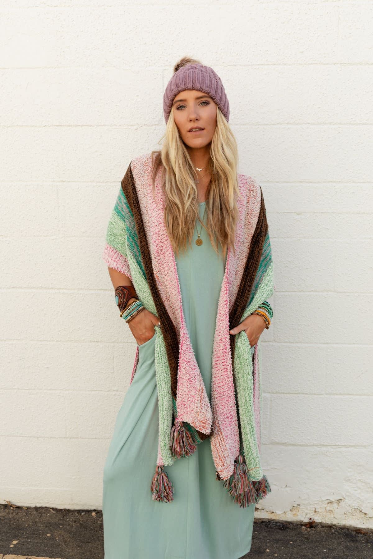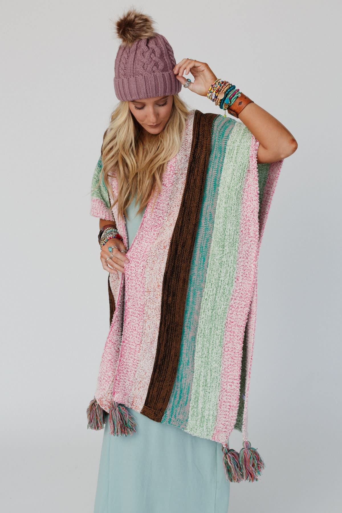 The perfect ruana to keep you warm over any of your favorite outfits is the Wandering Soul Striped Tassel Ruana!