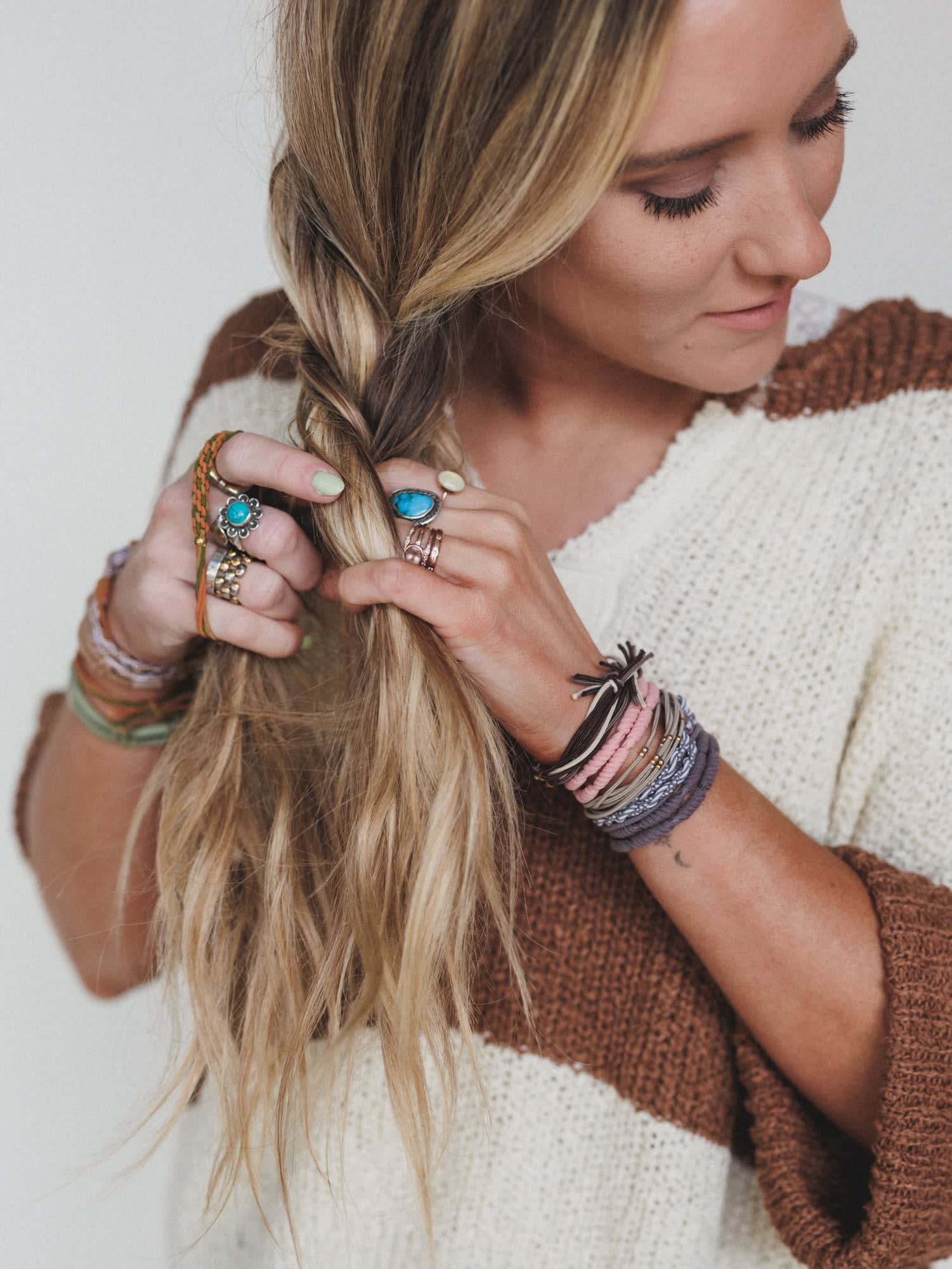 • Luxe Loop Hair Tie Set: Multi-color elastic hair wraps that double as stackable boho bracelets