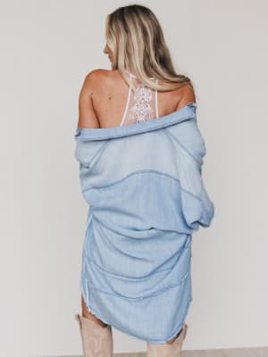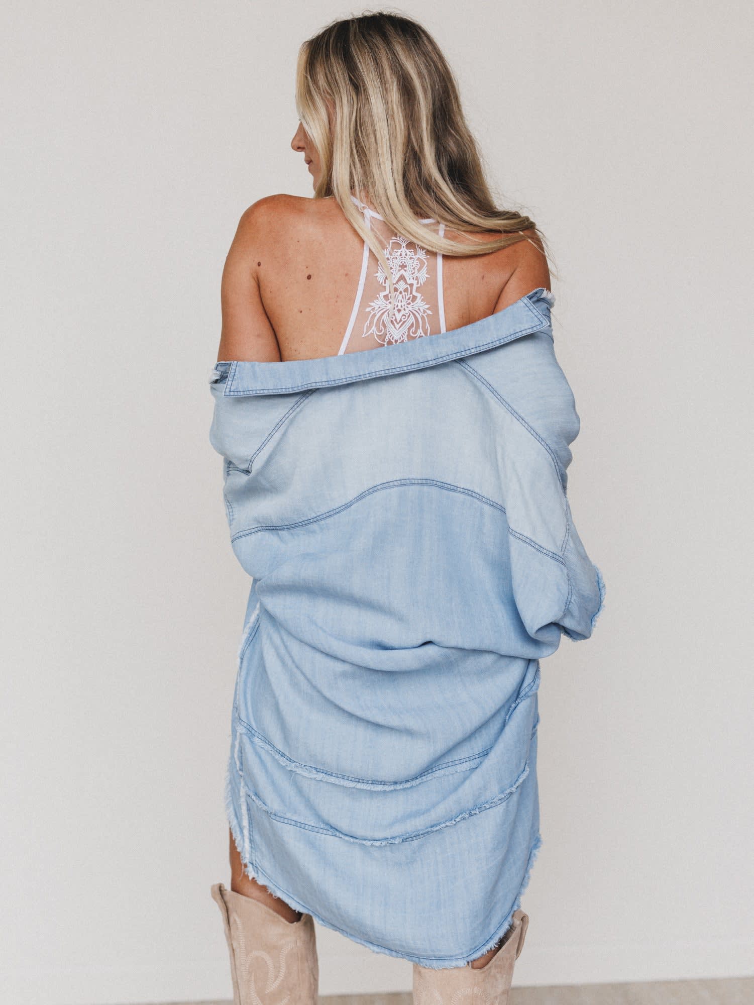 - The Ophelia Oversized Denim Dress with raw edge details and a relaxed, throw-it-on silhouette