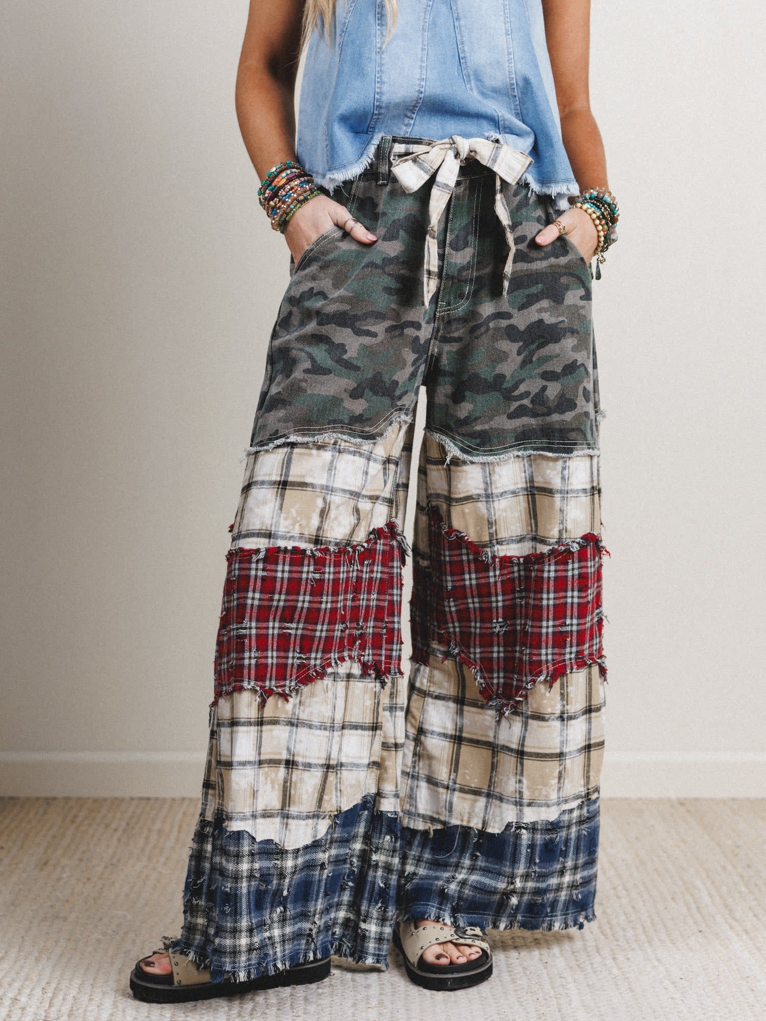 Camo Meets Plaid Wide Leg Pants: - 100% Cotton