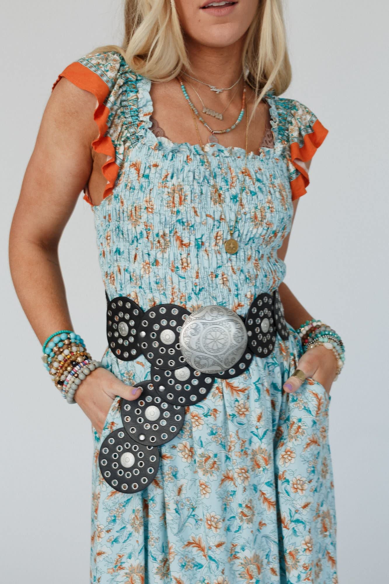 Embrace the spirit of the Wild West with our Western Sunrise Belt, a striking accessory that exudes rustic charm and timeless bohemian elegance. Whether cinching your waist over a flowing maxi dress or adding a touch of Western flair to your favorite denim ensemble, this belt effortlessly elevates any outfit with its cool, rustic vibe!