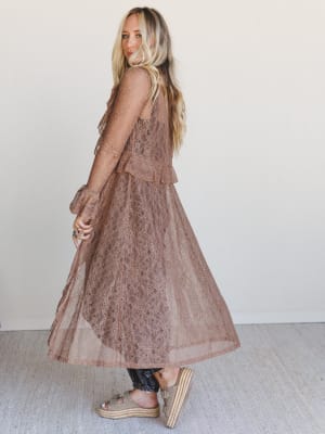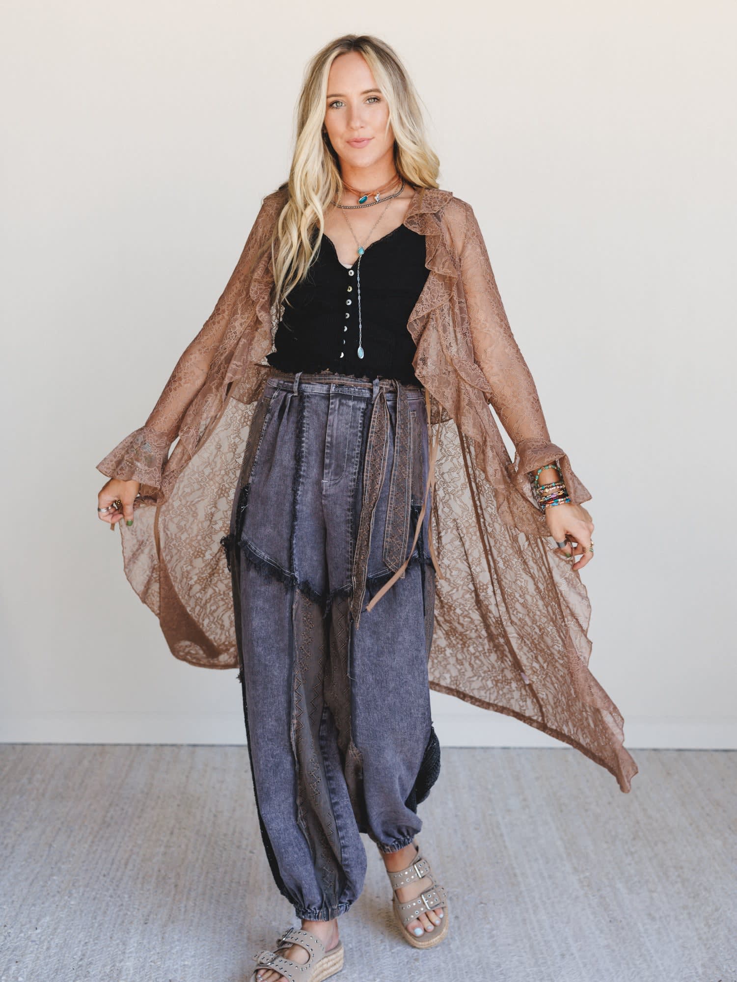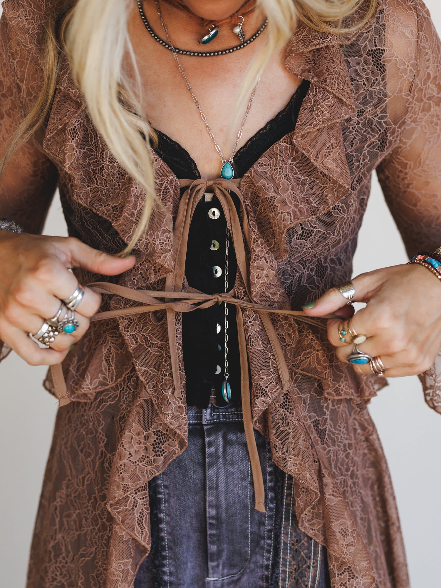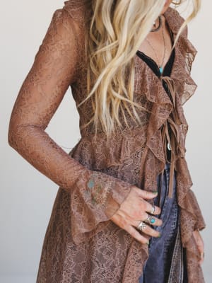 Light as a breeze and layered with charm, the Western Winds Duster is your go-to piece for instant drama. With its sheer lace construction and romantic silhouette, this piece pairs perfectly with dresses or denim for a bold, boho-luxe look.