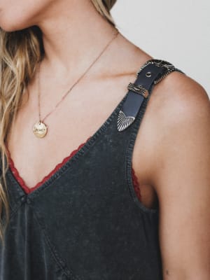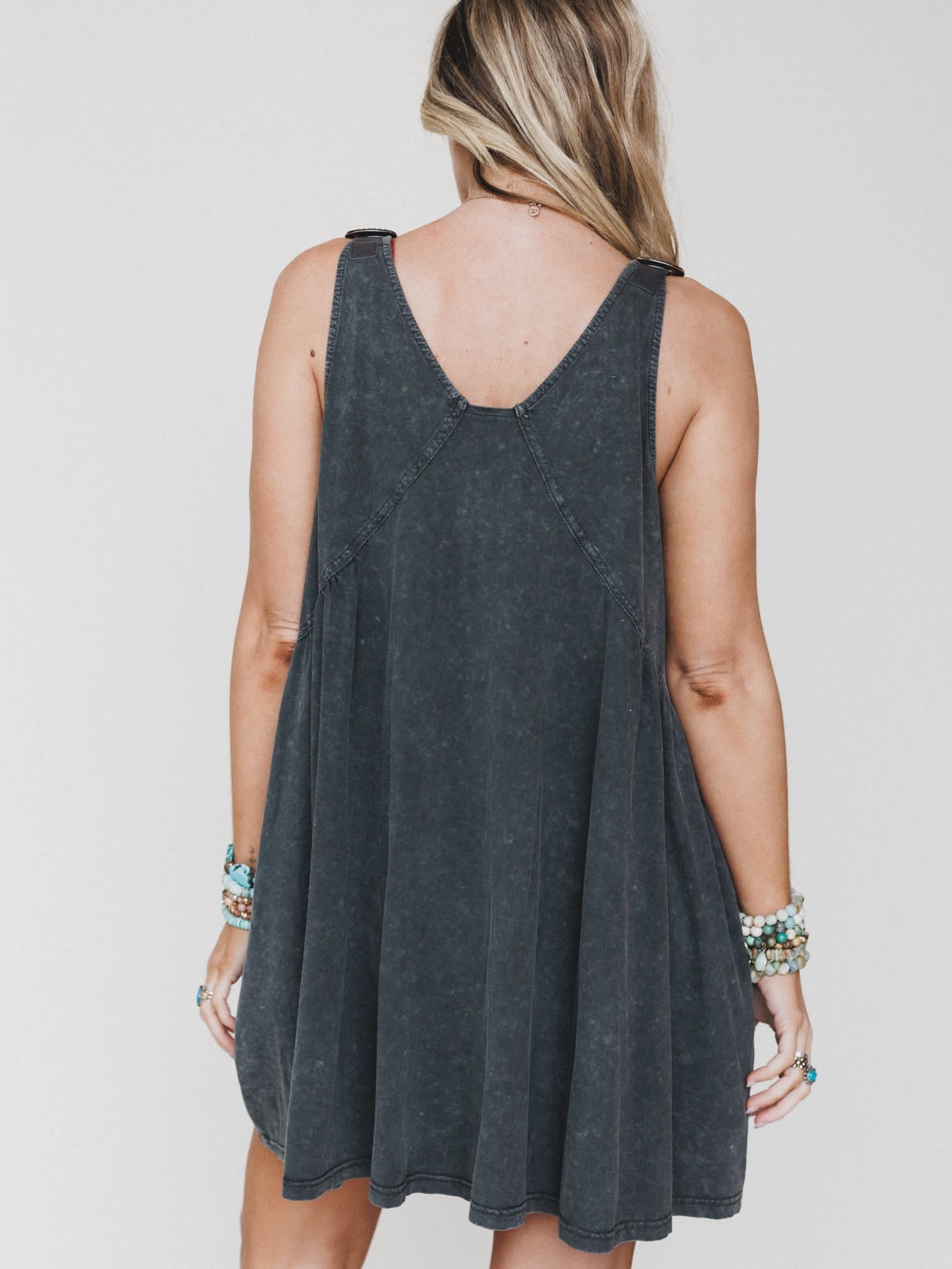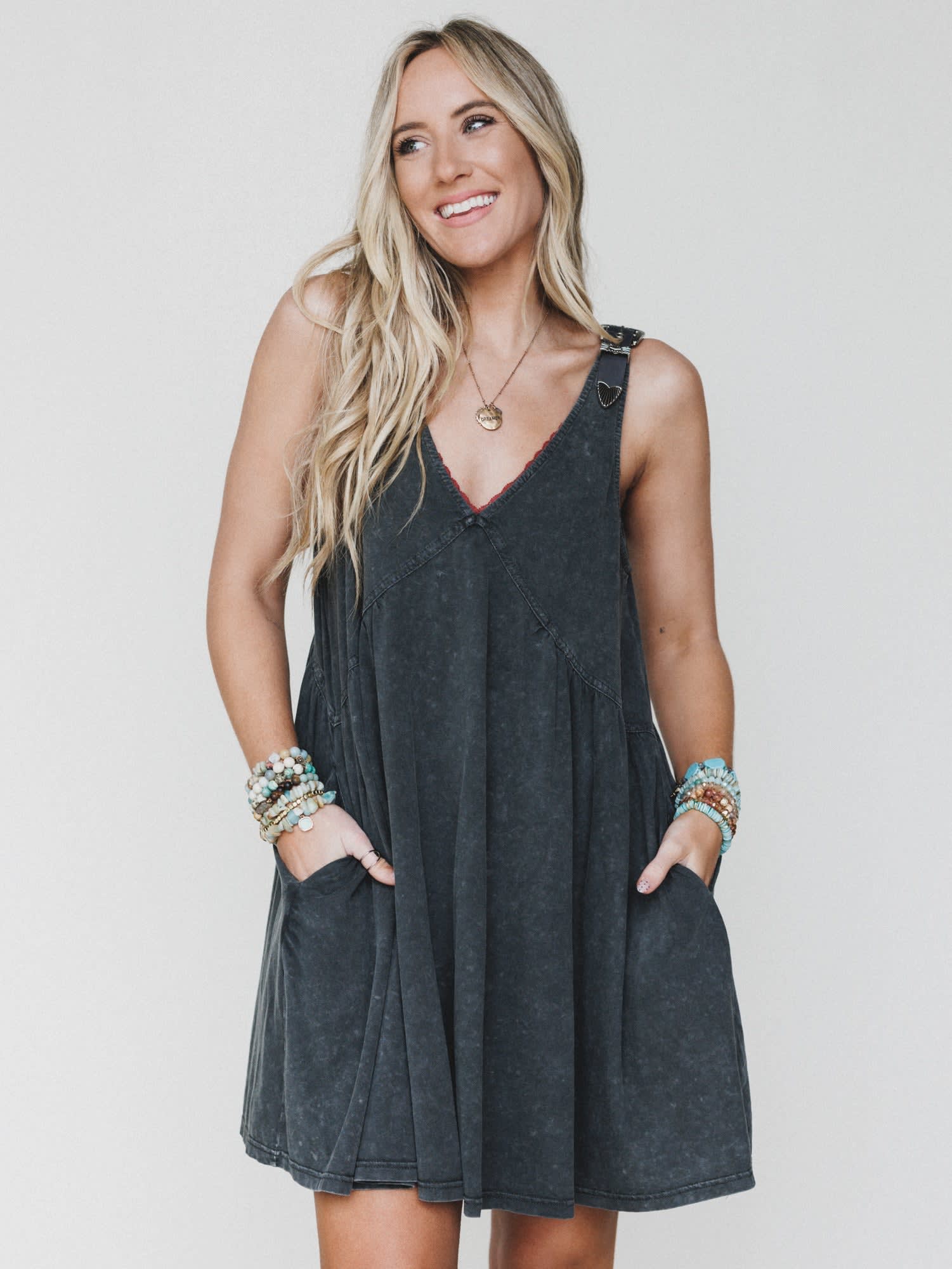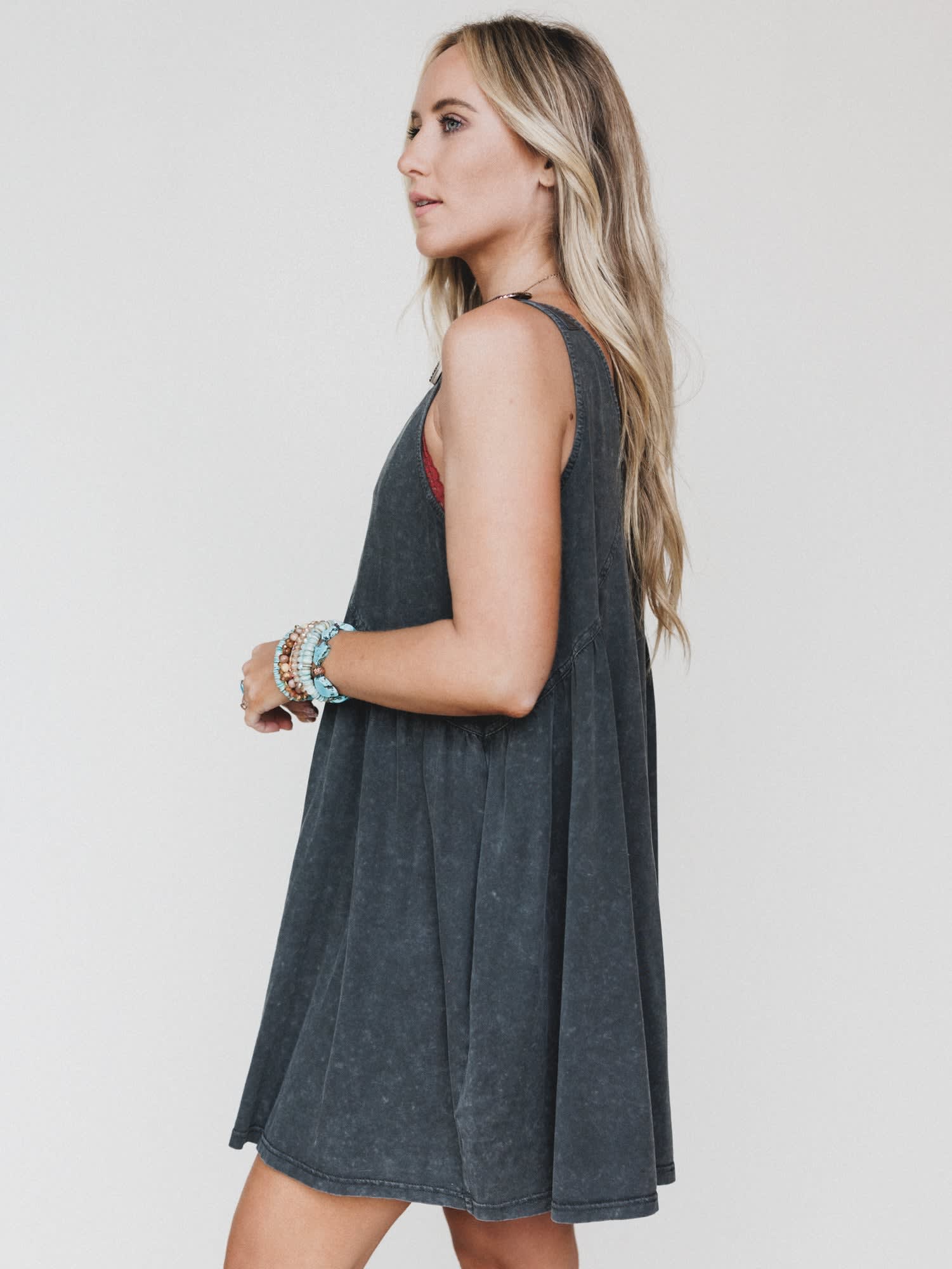 - Whisked Away Dress in washed charcoal with relaxed swing fit, adjustable straps, and statement western hardware detail