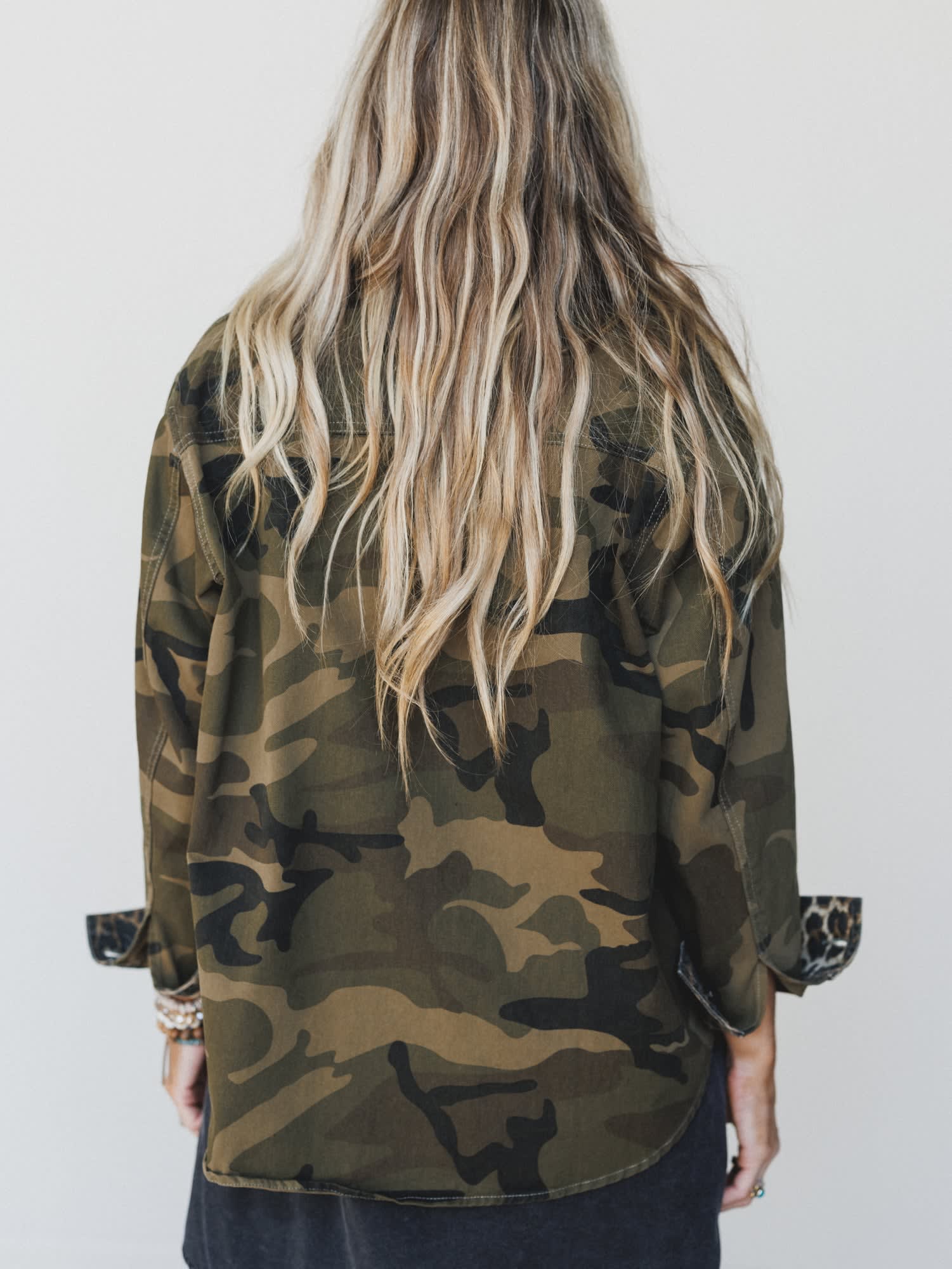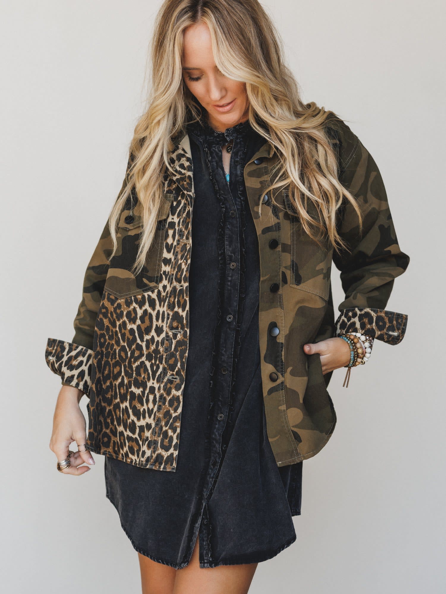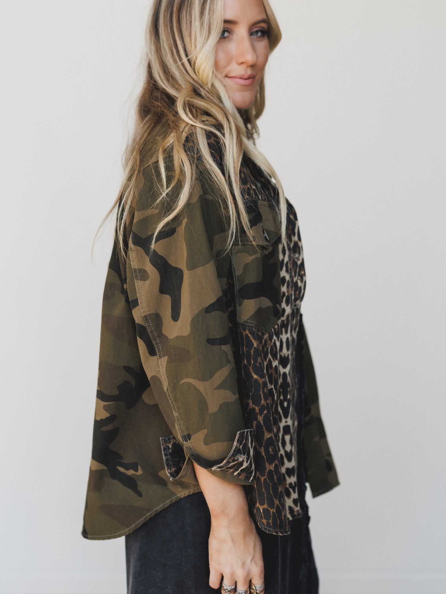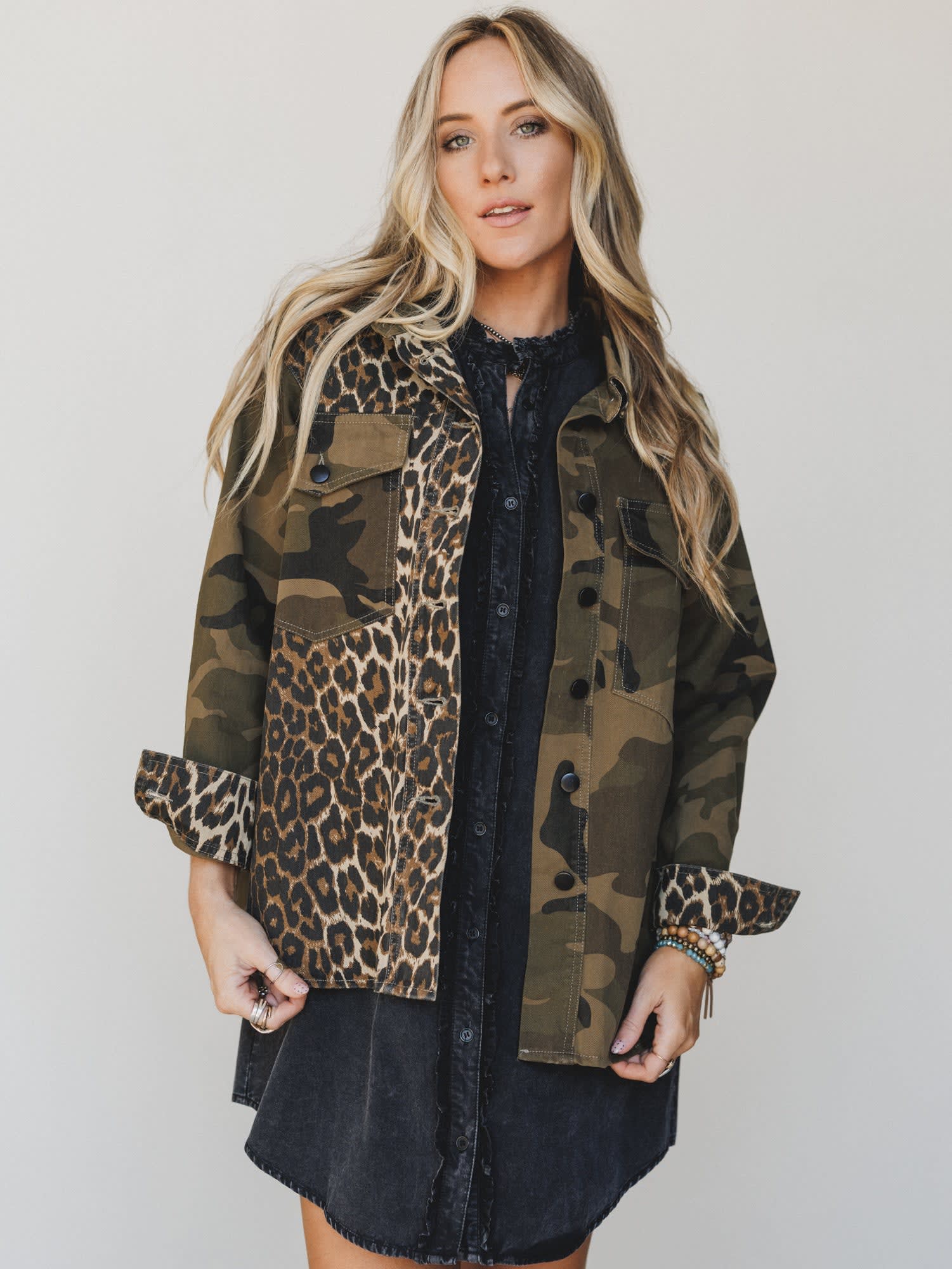 • Classic camo print with leopard contrast panels for a bold, eye-catching look