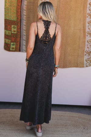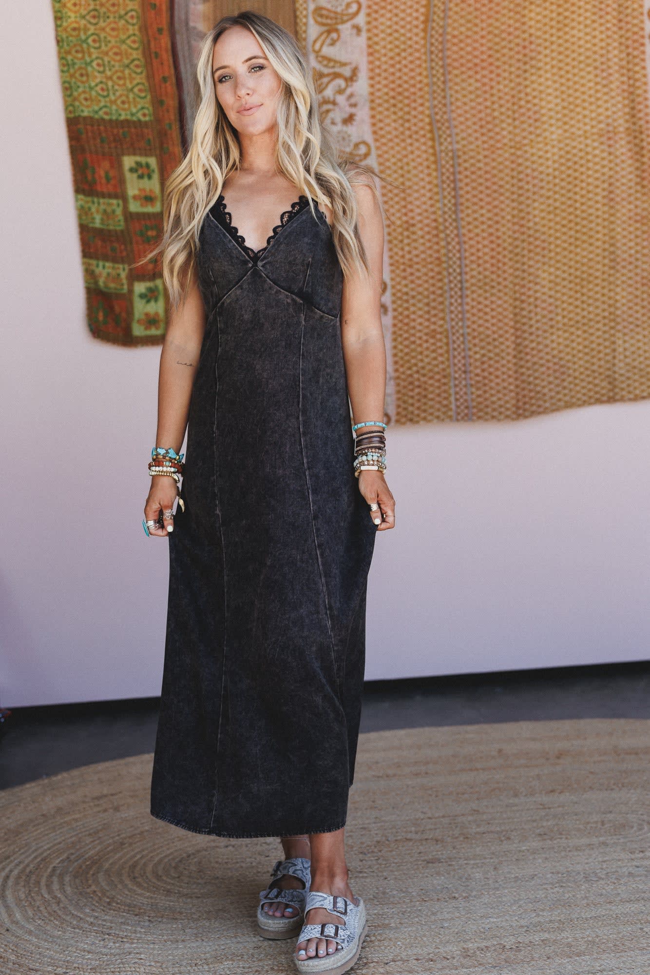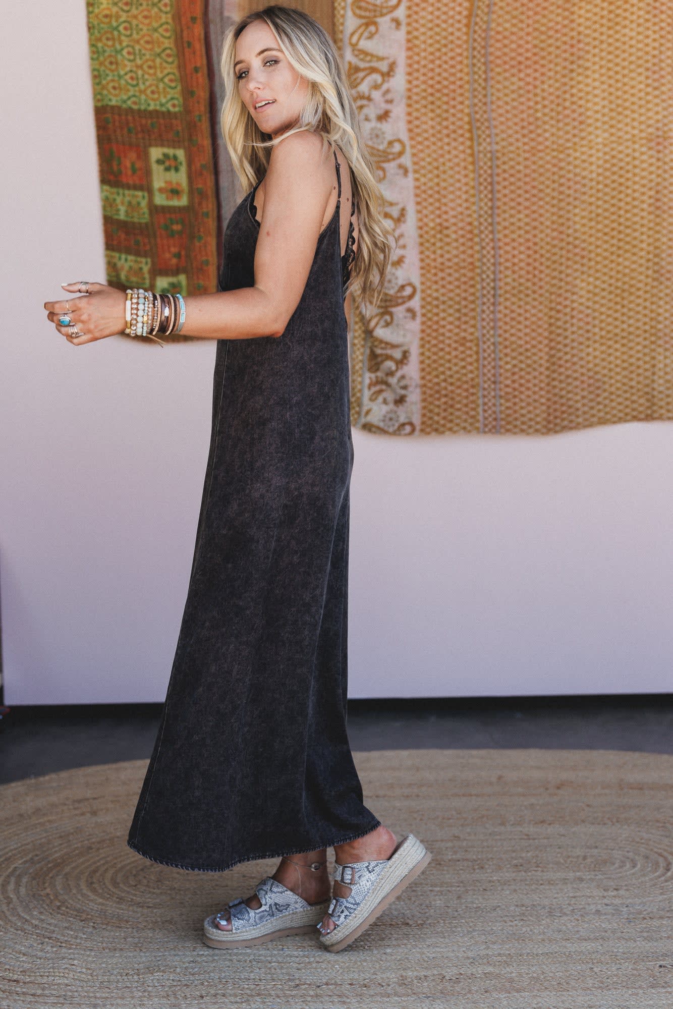 This acid wash maxi dress is a simple layer you can easily dress up with a leather jacket and jewels.