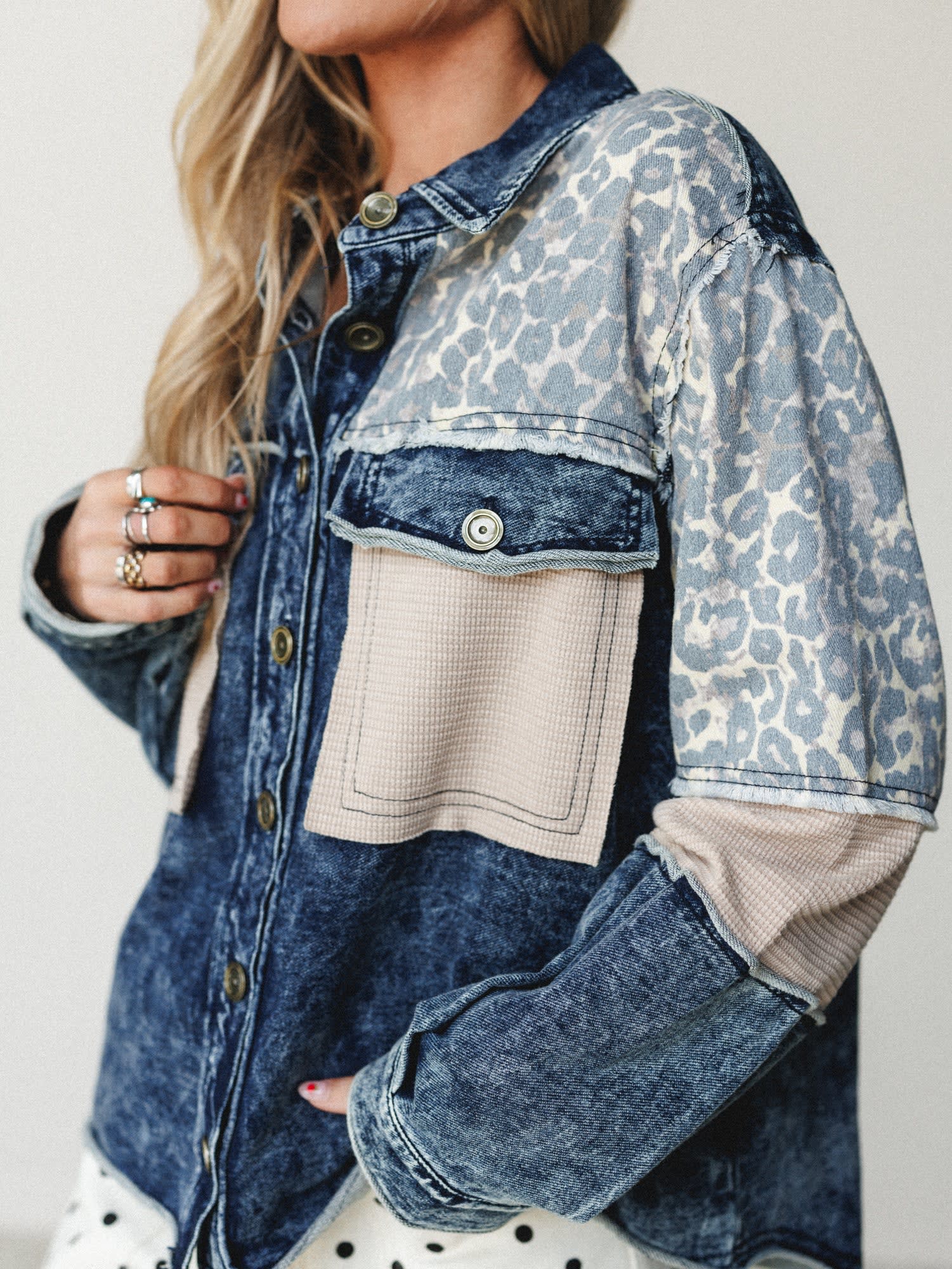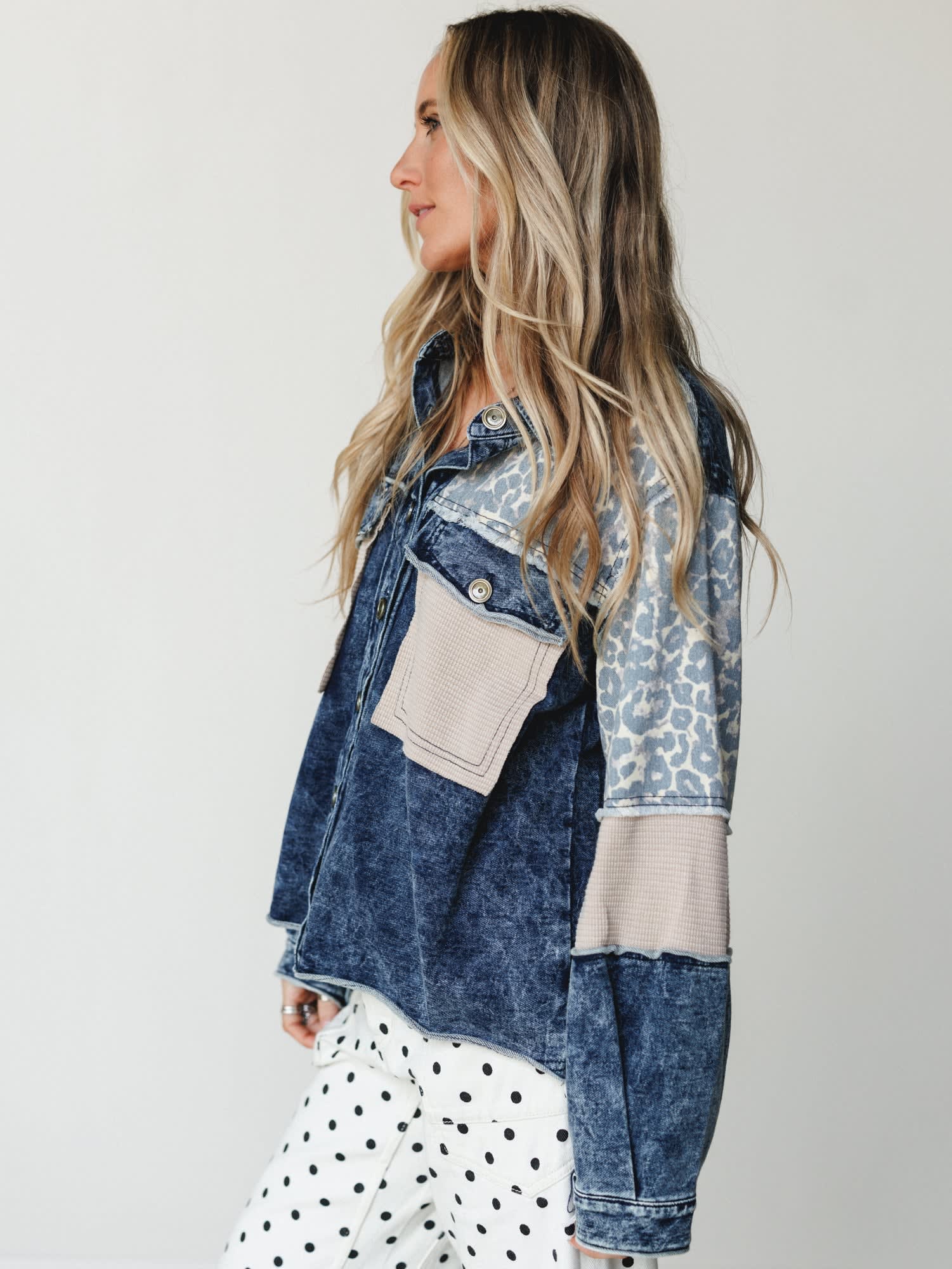 - Unique patchwork construction combines denim, corduroy, and leopard print panels for ultimate texture play.