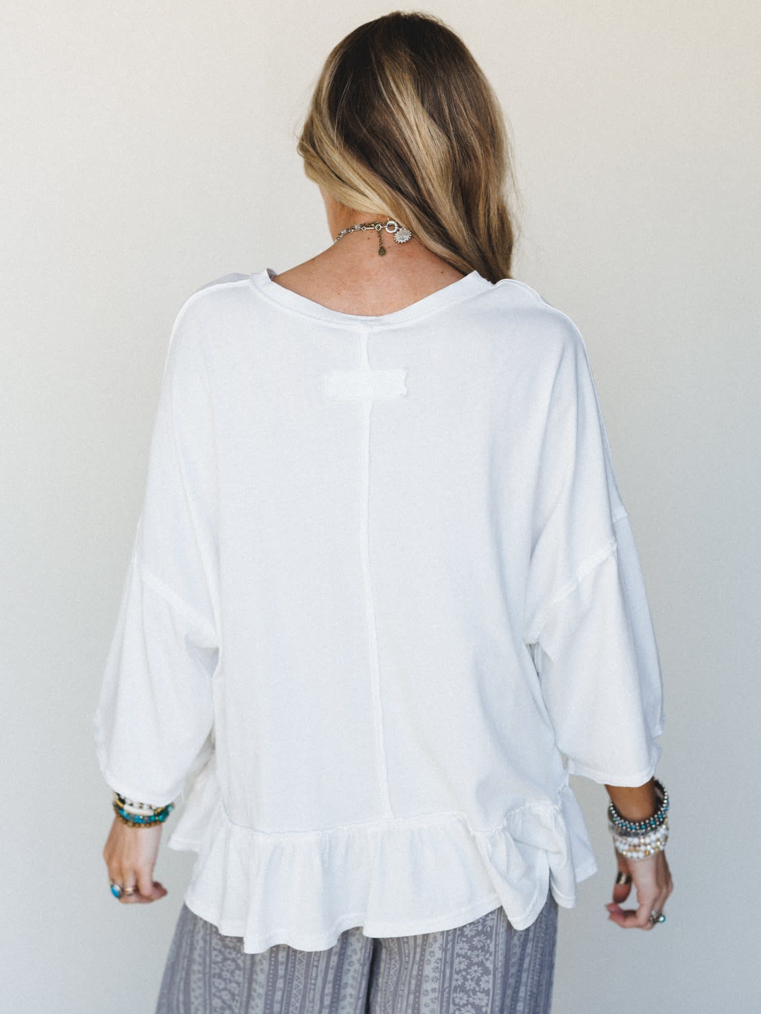 - Ruffle hem detail adds a feminine touch to a classic casual top