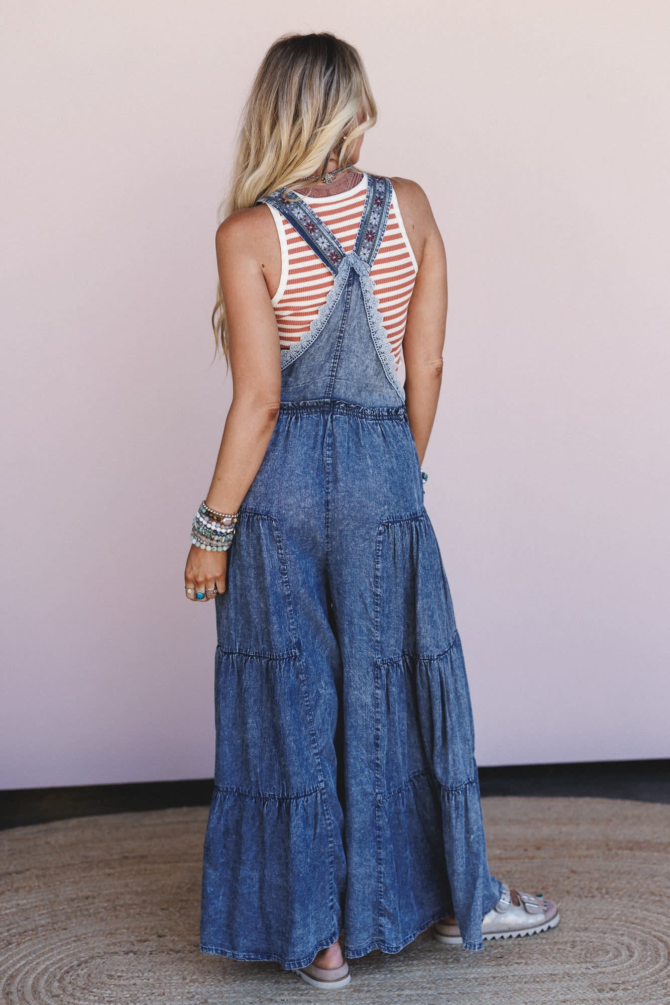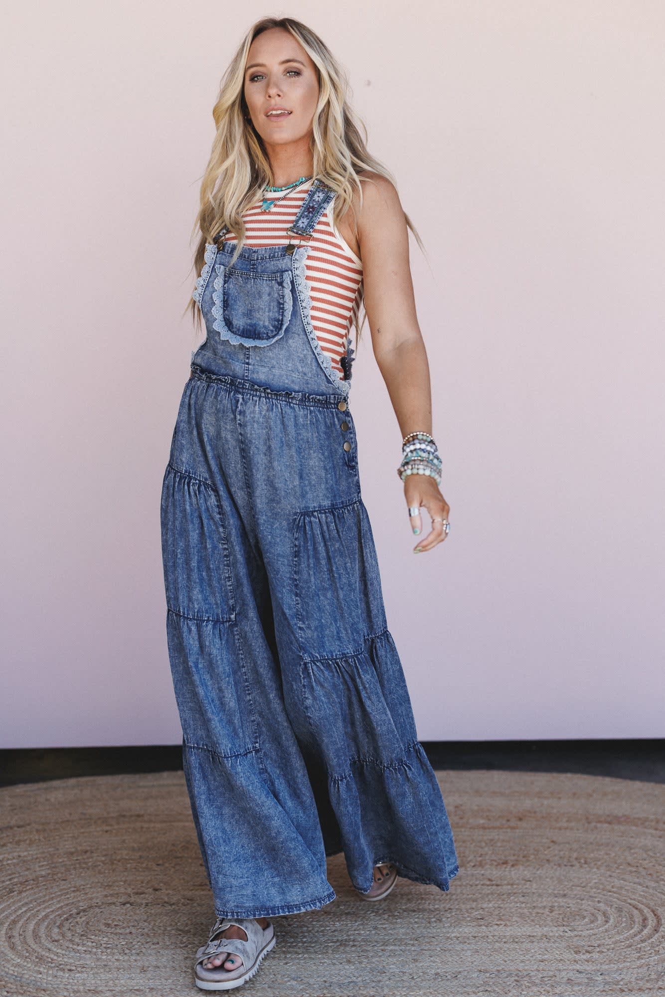 These tiered wide leg overalls look amazing with a plain tee or tank to let them take center stage.