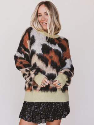 - Fuzzy knit texture in a painterly leopard print with earthy sunset tones