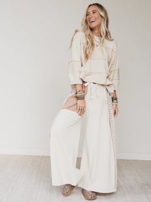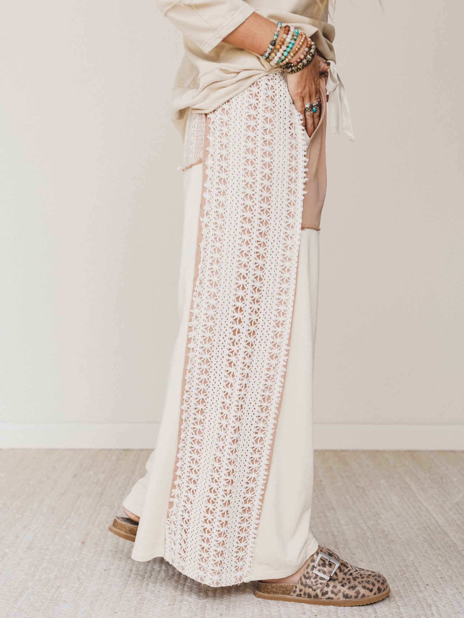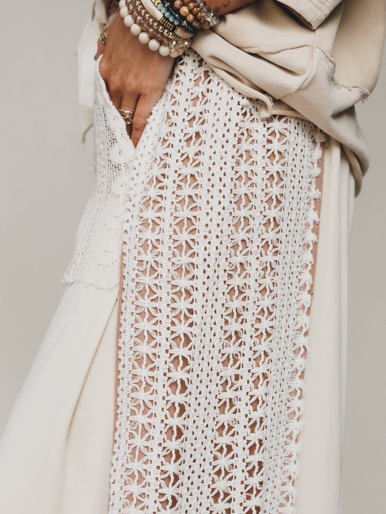 Take a deep breath and let the Willow Breeze Pants whisk you away to your favorite slow mornings or sunset strolls. Designed with romantic crochet panels and an easygoing fit, these pants embody laid-back boho elegance with every step.