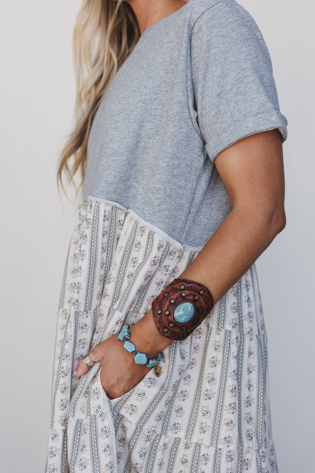Soft tiers and a relaxed fit make this gray dress a dream for sunny days and cozy evenings alike.