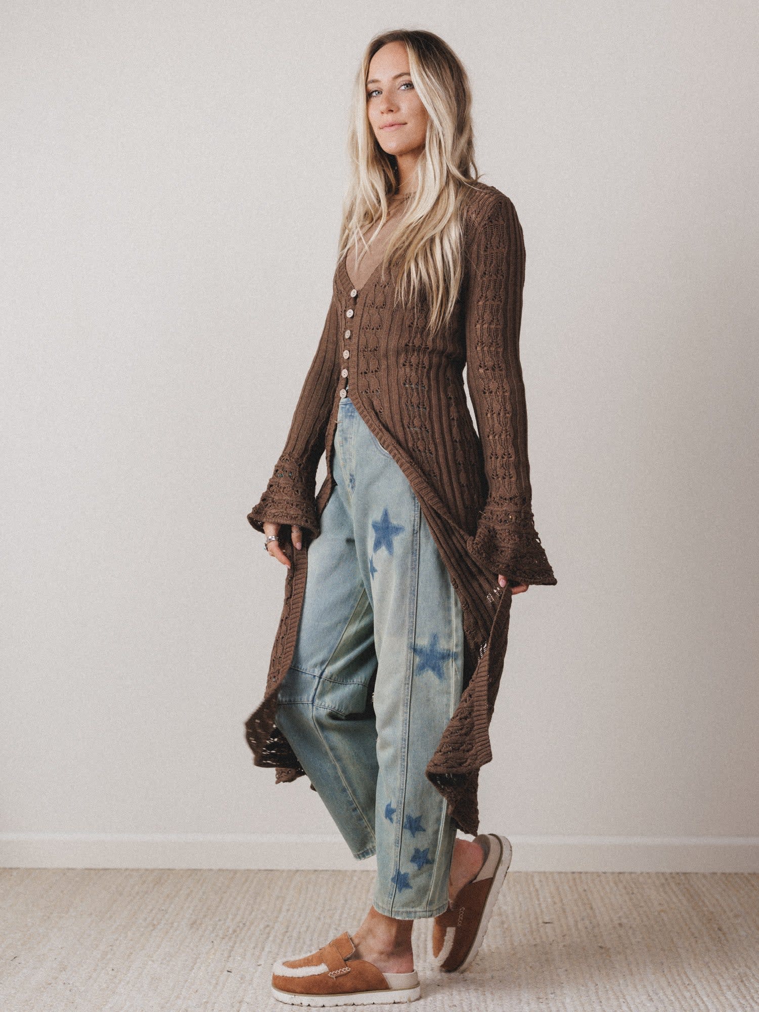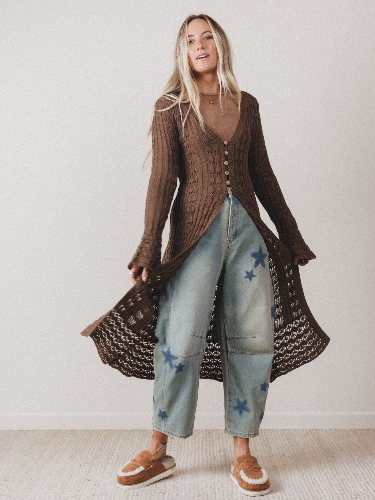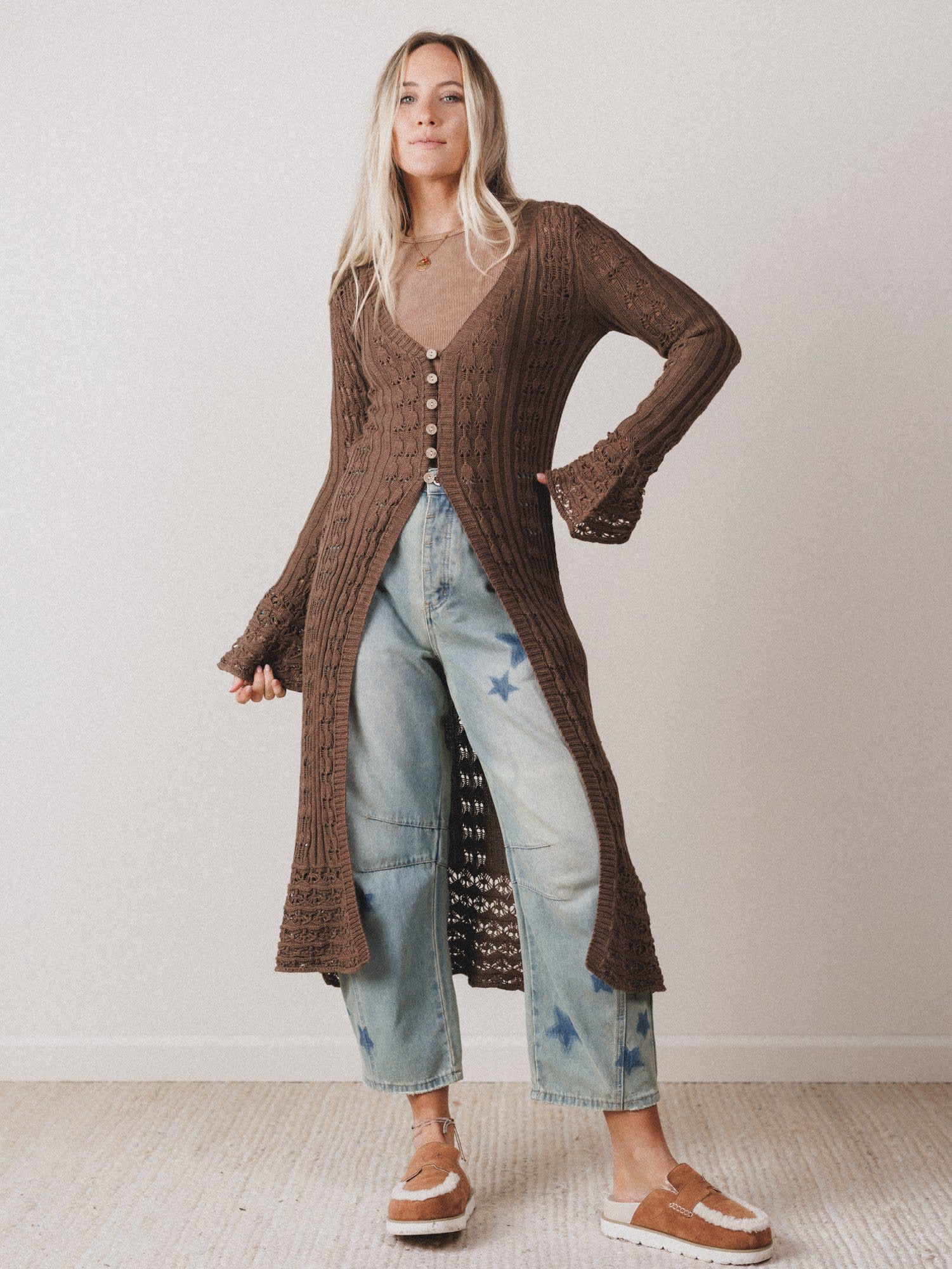 Wrap yourself in wanderlust with the Windswept Long Knit Cardigan — a cozy-meets-boho staple that flows with every step you take. This duster-length dream features an intricate open-knit design and wood-toned button front that adds just the right dose of earthy charm.