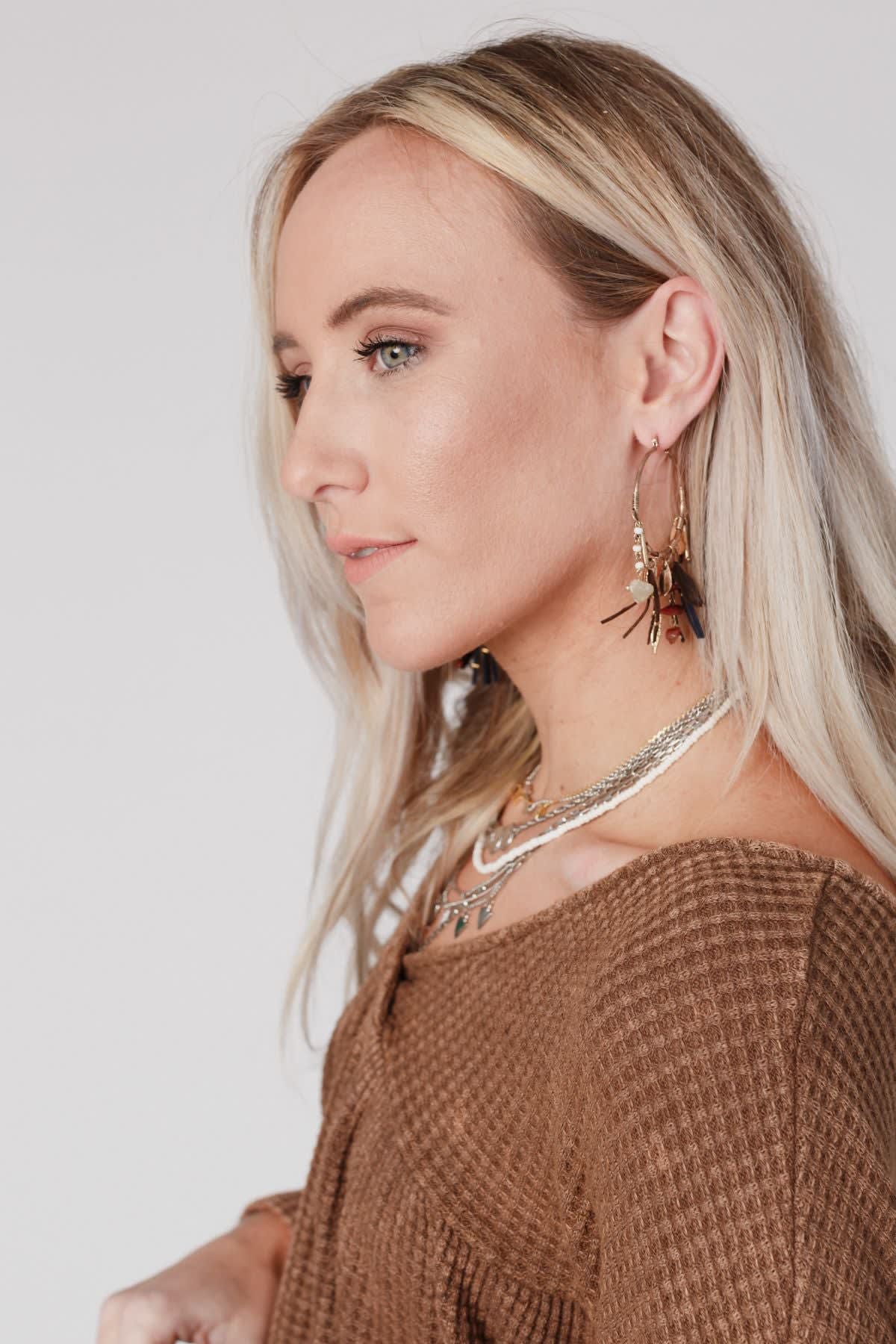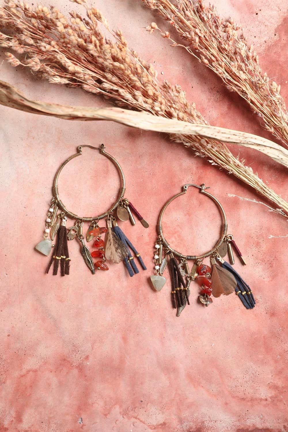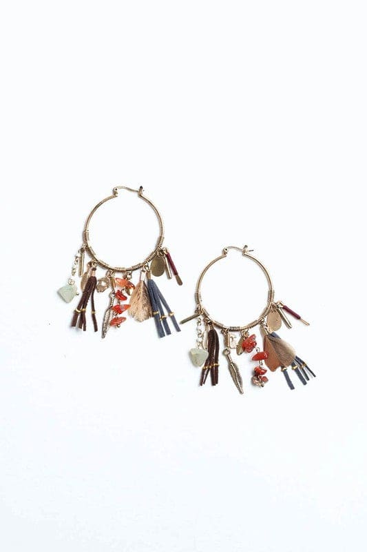Complete your outfit with these phenomenal boho hoop earrings! They feature a medium-sized hoop with beads, charms, feathers, chains, and suedes strips that dangle at varying lengths - the perfect boho touch!