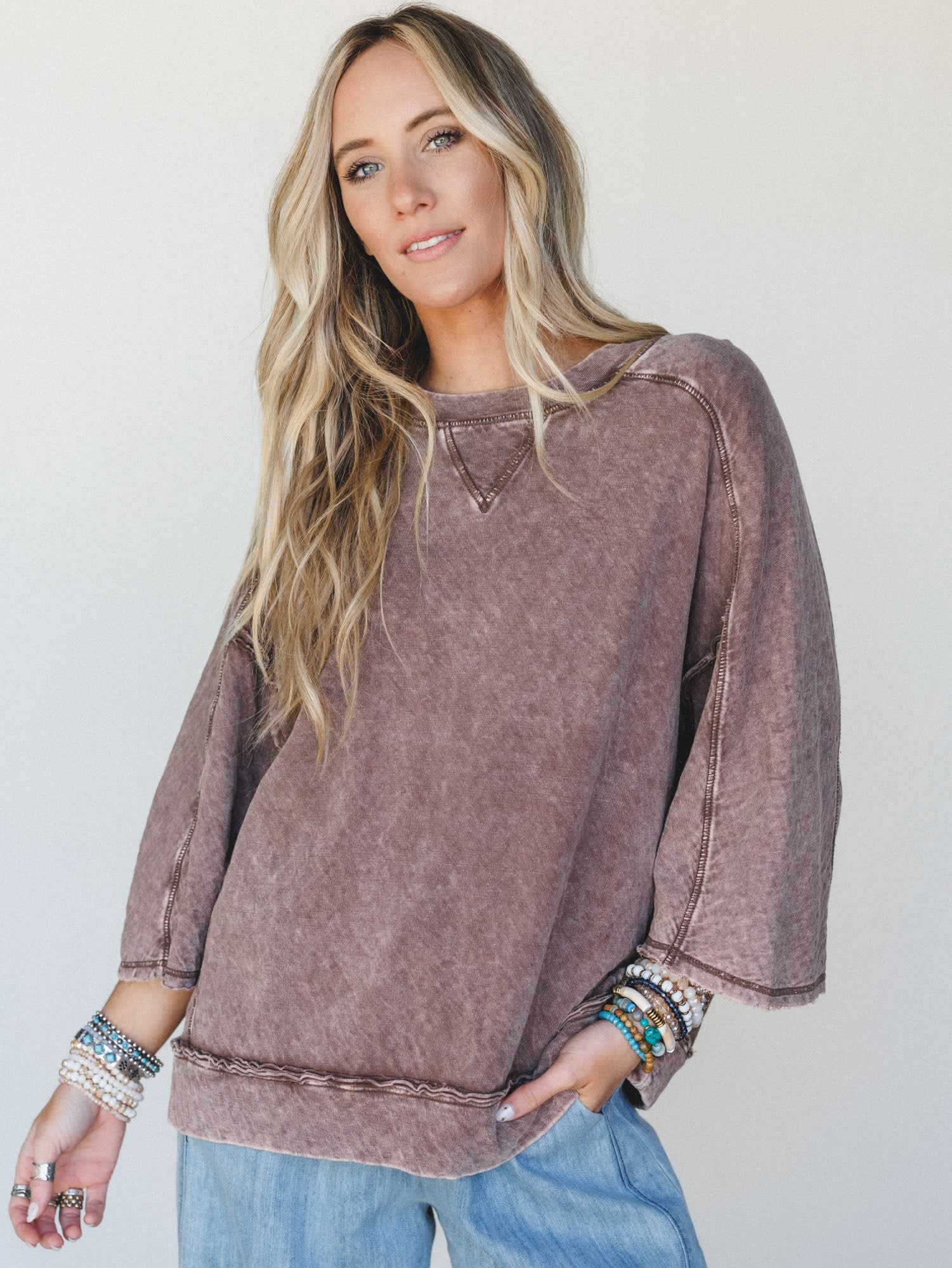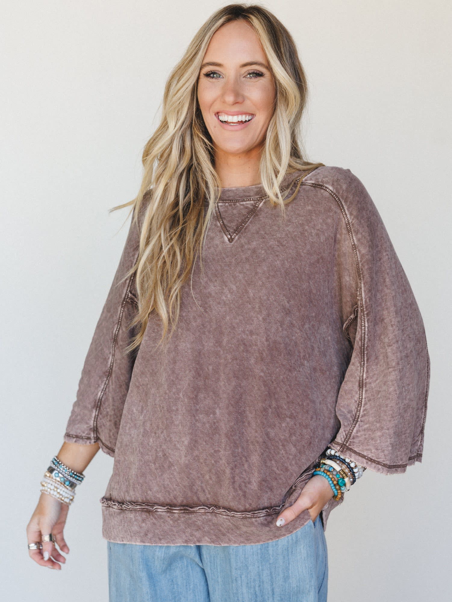 • Drop shoulder and wide sleeve design for a laid-back, boho look