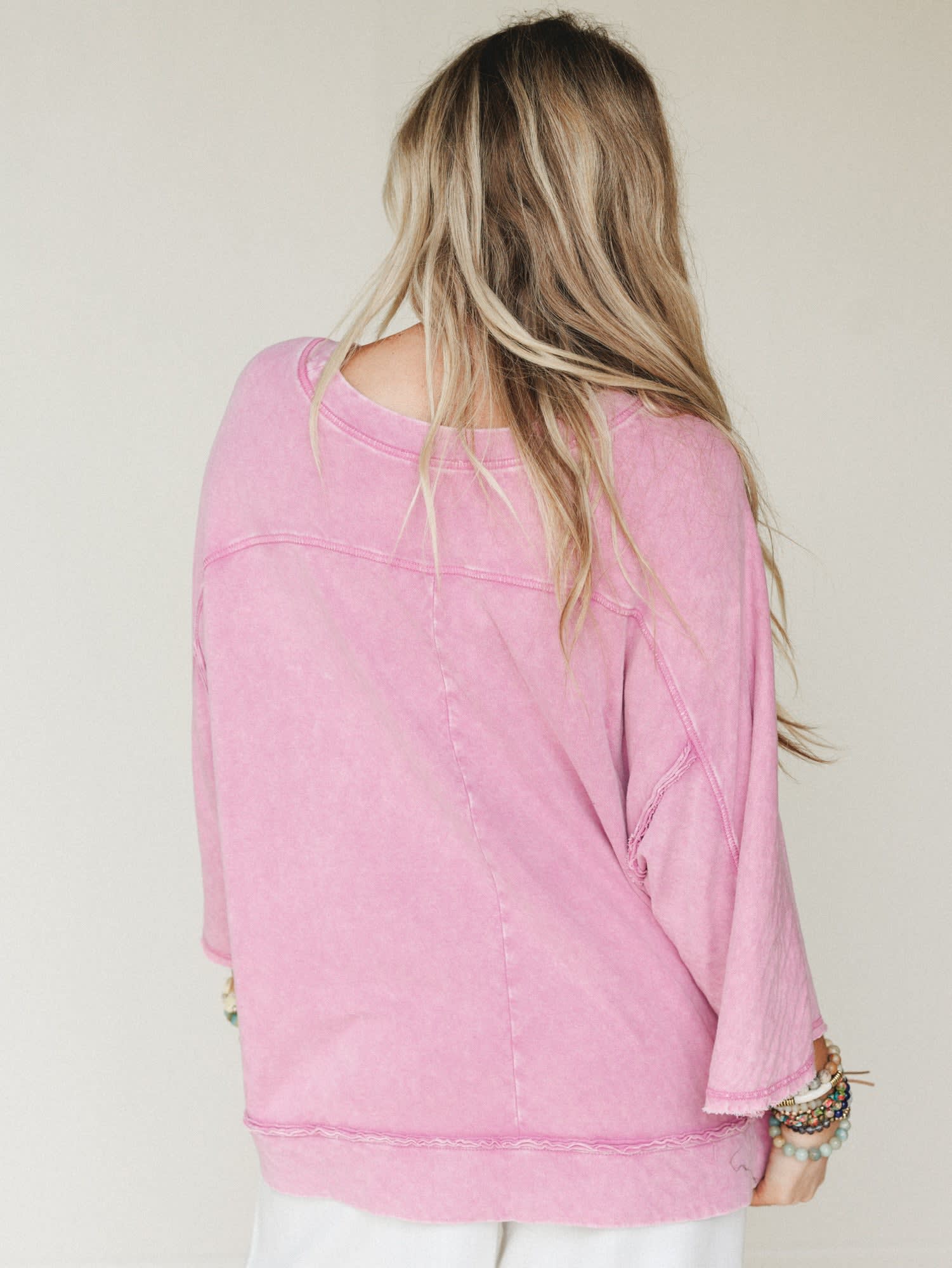 Dropped shoulders and wide sleeves create a laid-back drape.