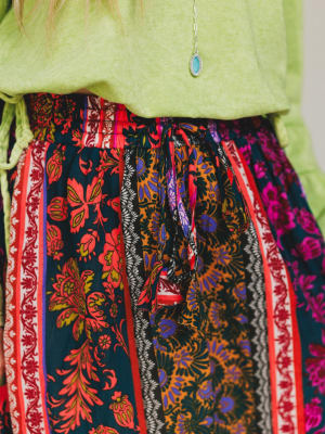 - Patchwork-style vertical stripes in vibrant floral and paisley prints