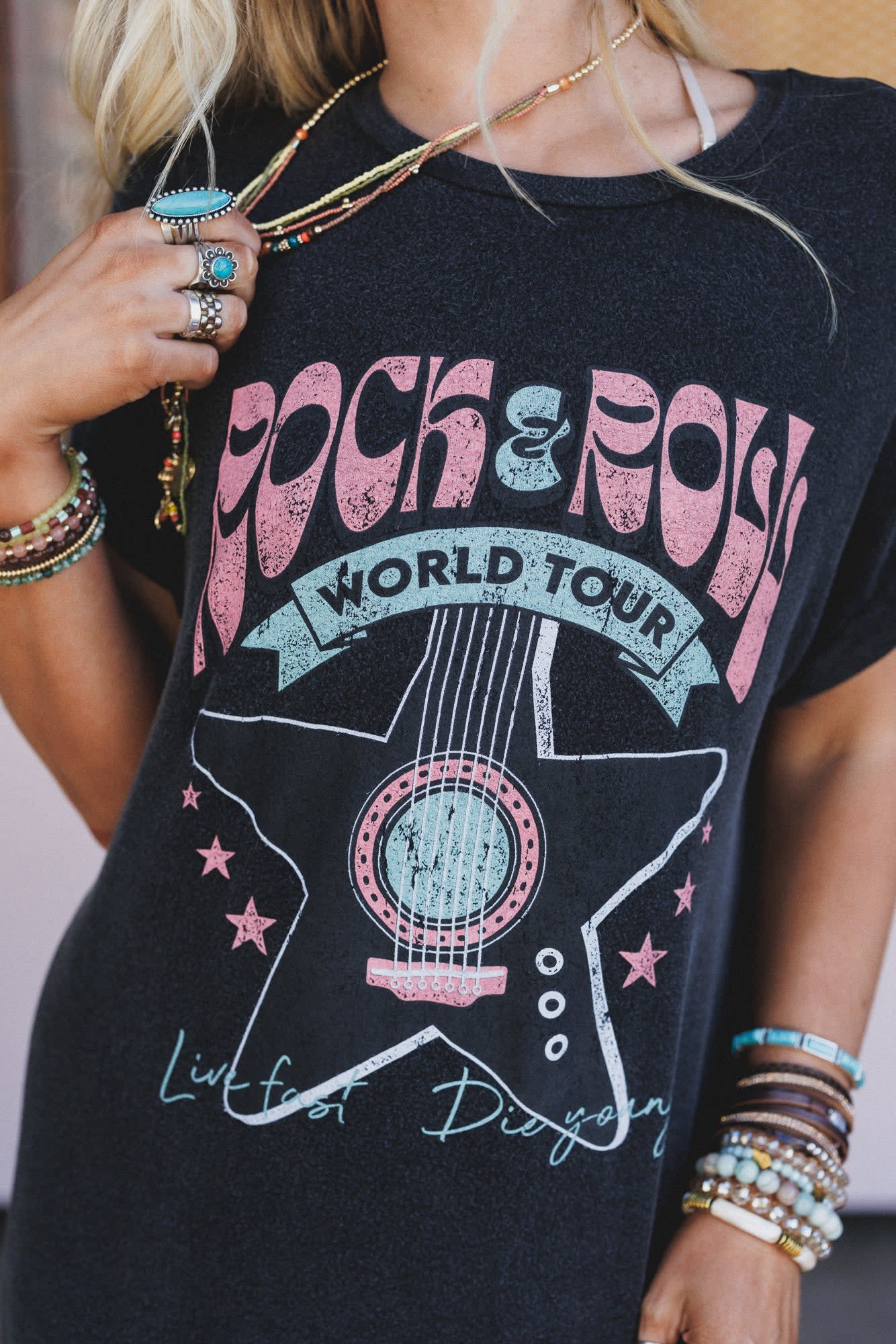 Channel your inner rock star with this groovy band t-shirt that looks amazing with bell bottom jeans.