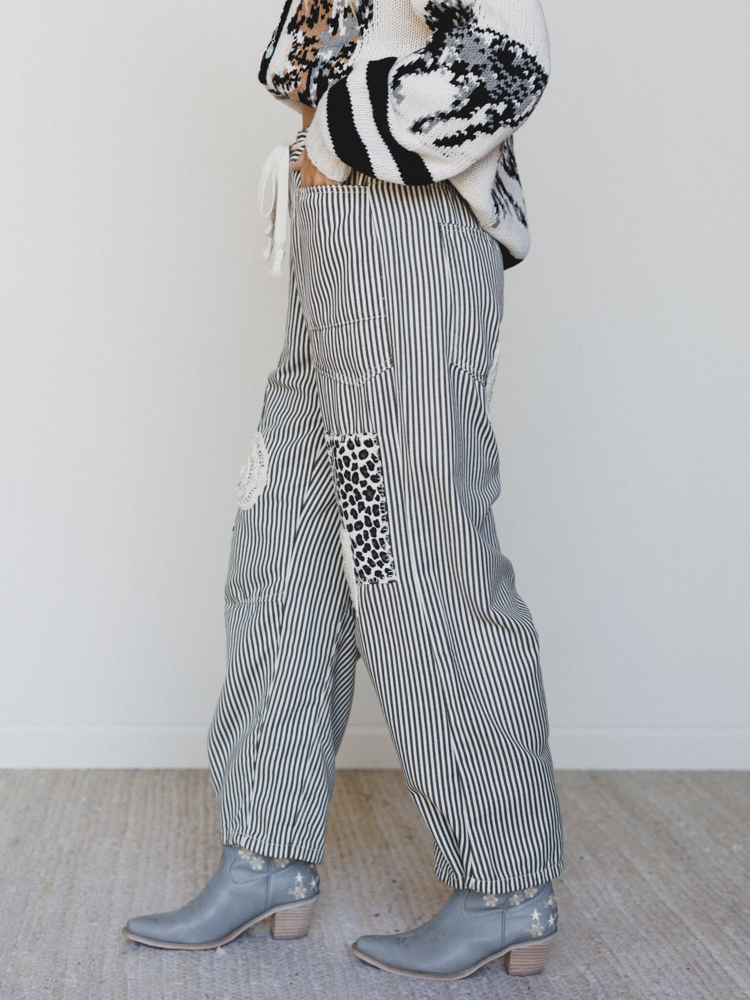 • Black and cream vertical stripe pattern with mixed patchwork and crochet accents for true boho chic style