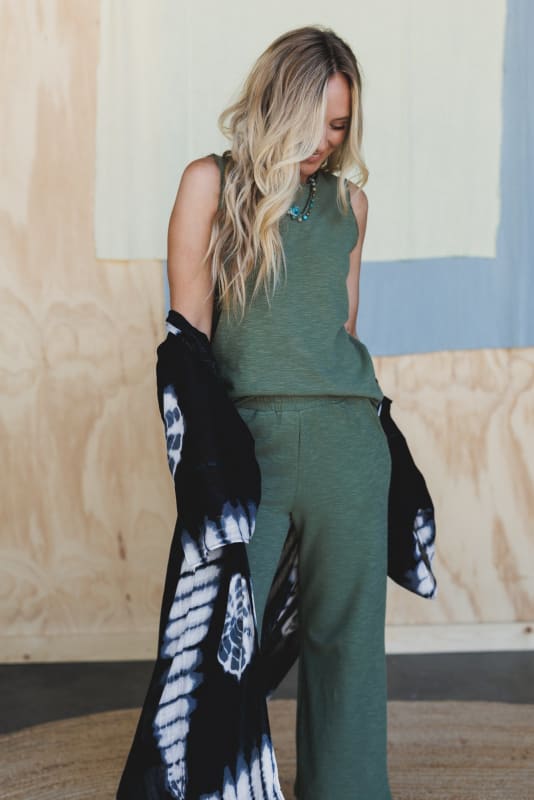 This matching top and bottom set can be easily dressed up with booties and layered necklaces and bracelets.