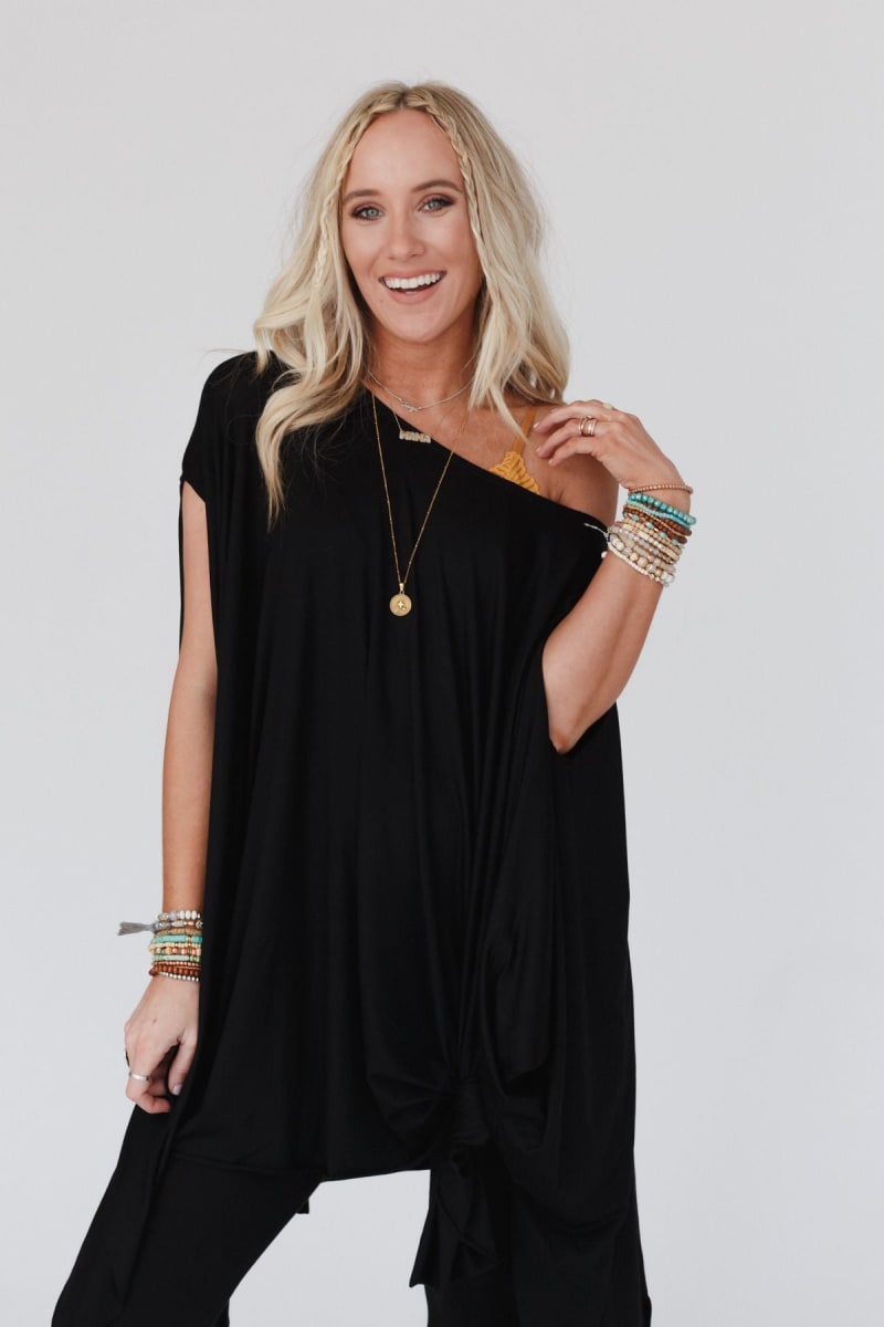 • As a dress or tunic top, this cute and comfy piece has a trendy, slouchy silhouette. This closet favorite is a one-size piece that can be layered over tanks and bralettes, worn on or off-the-shoulder, and styled with a knot in the hem.