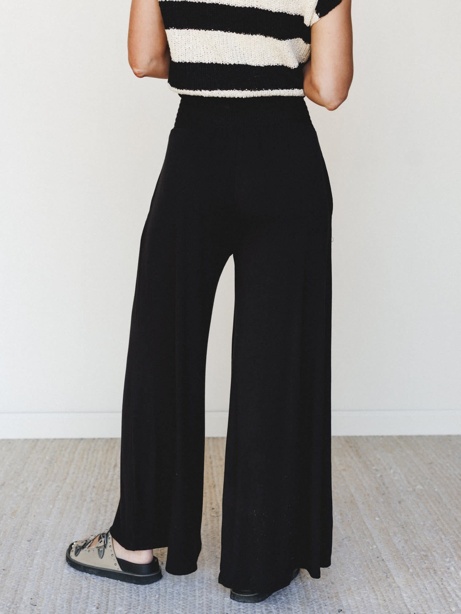 • Wide leg pants offer an ultra-flattering silhouette with a flowy drape and comfortable elastic waistband for all-day ease.