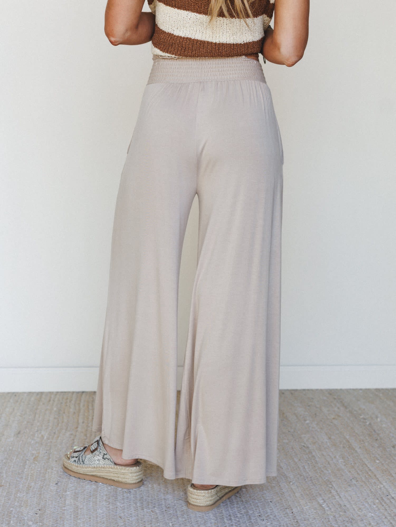 - Includes ultra-comfortable wide leg pants made from soft, flowing fabric with convenient side pockets.