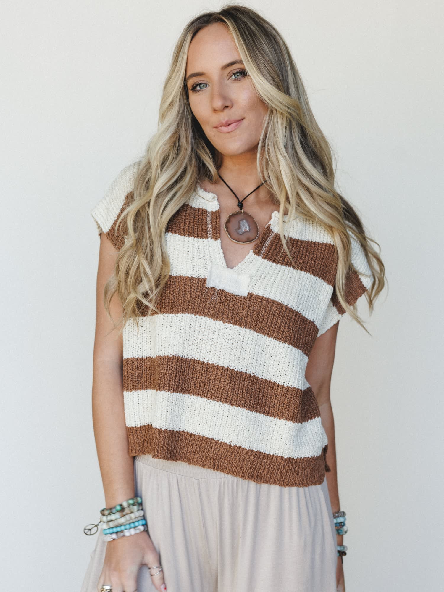 - Features a striped sweater vest with classic nautical-inspired lines and relaxed sleeveless silhouette.