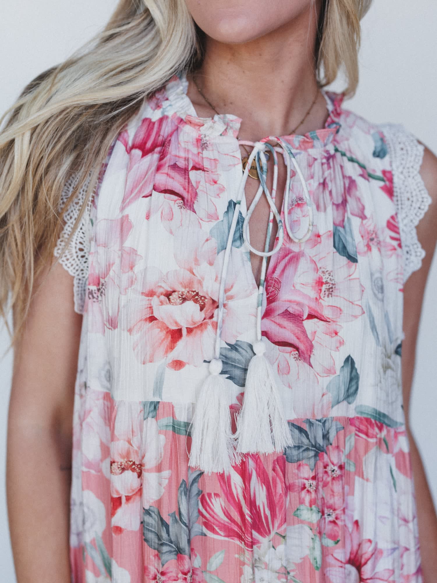 - Sleeveless design with crochet lace trim and tassel tie neckline
