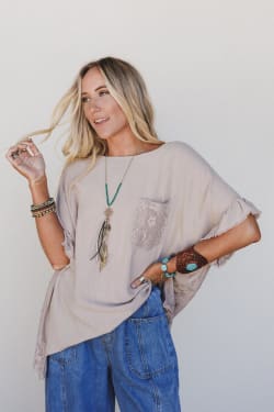 This romantic top adds a little unexpected drama with its lace-up back and soft khaki hue—perfect for festivals or coffee shop hangs.
