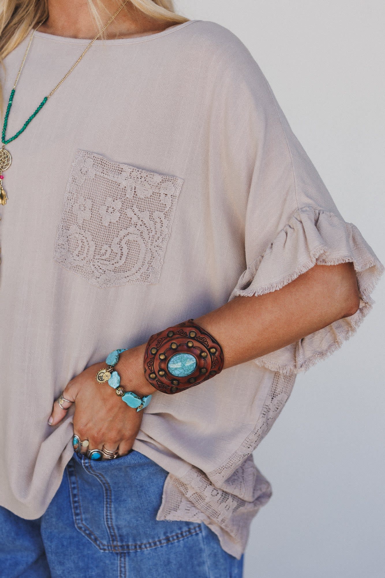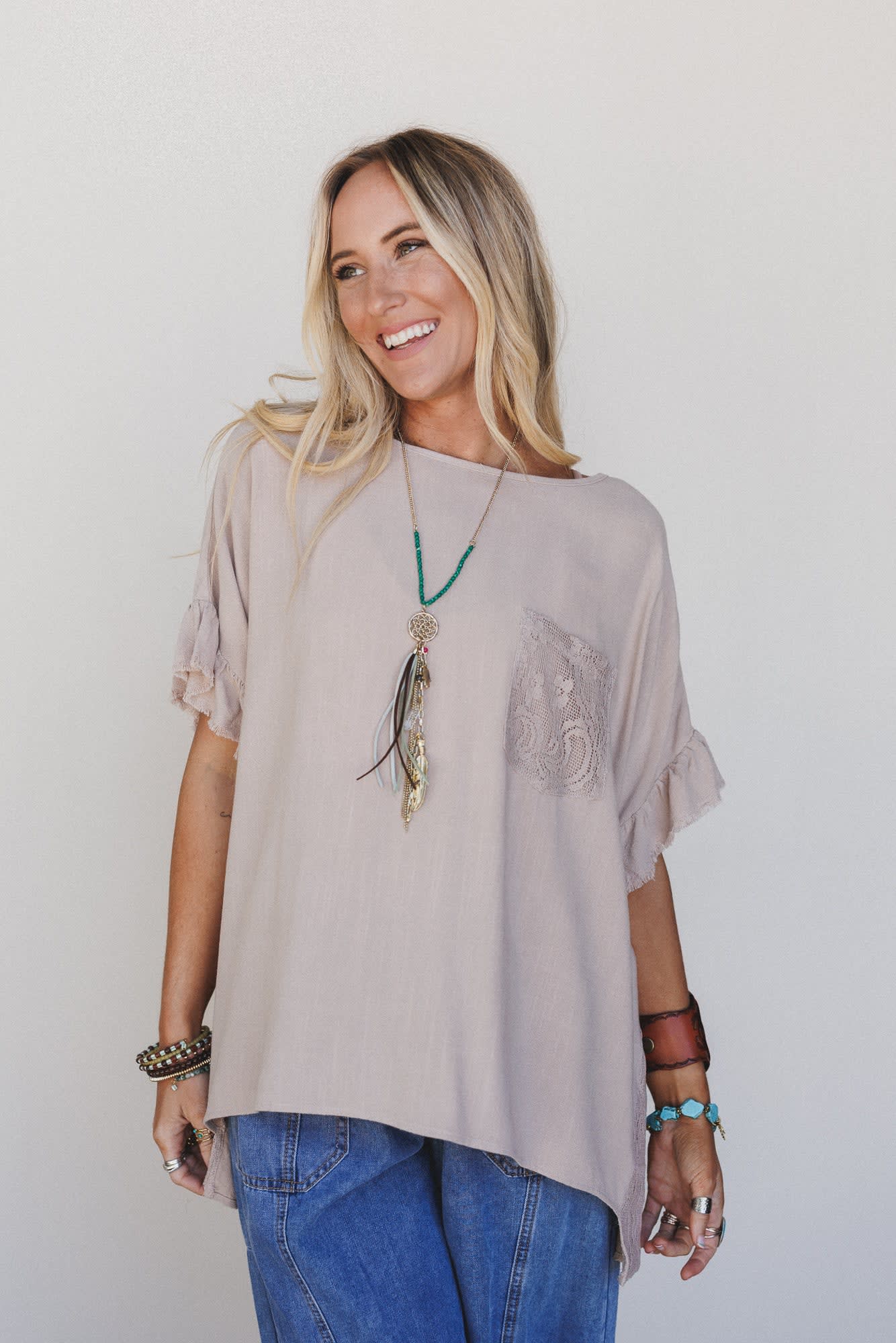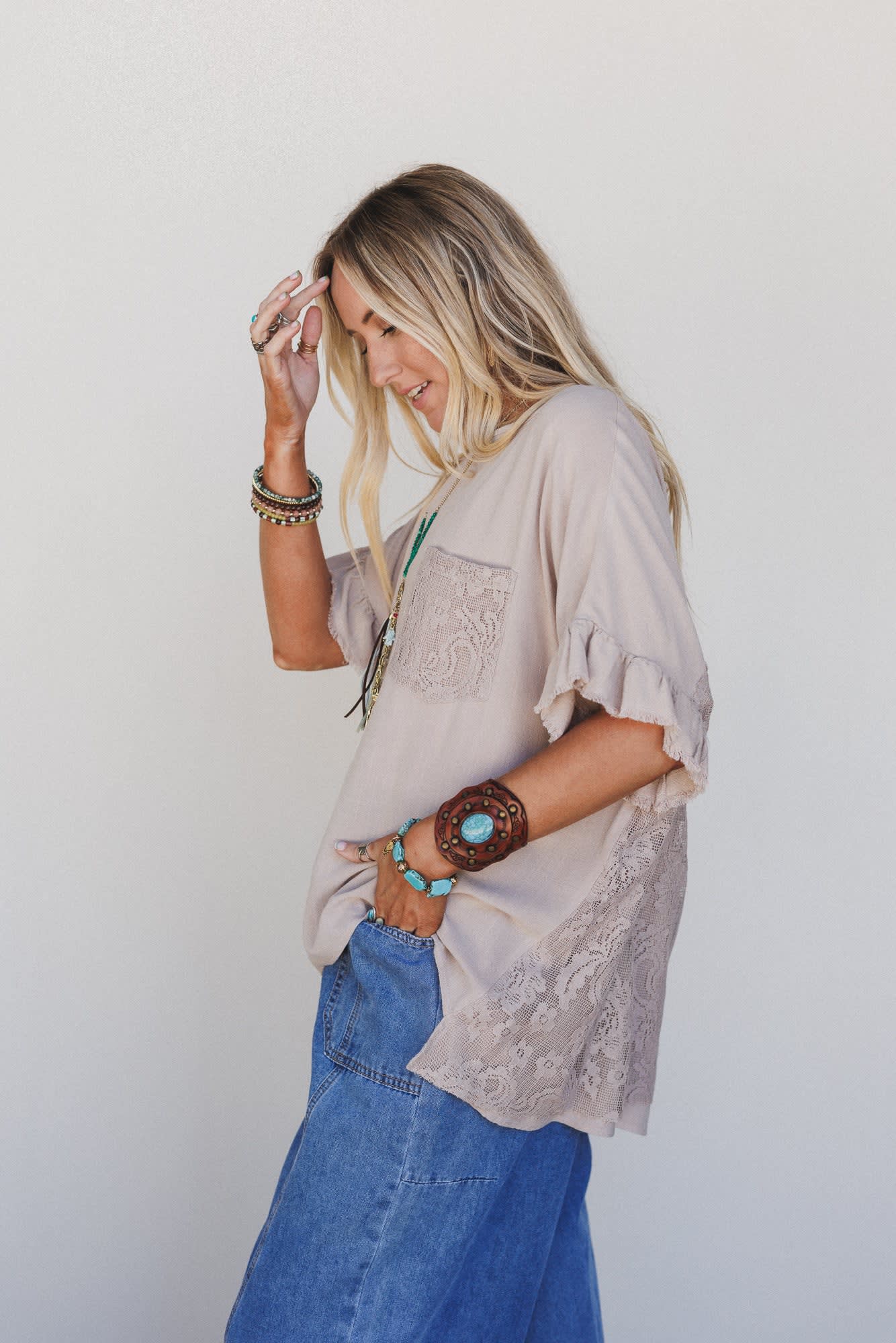 This romantic top adds a little unexpected drama with its lace-up back and soft khaki hue—perfect for festivals or coffee shop hangs.