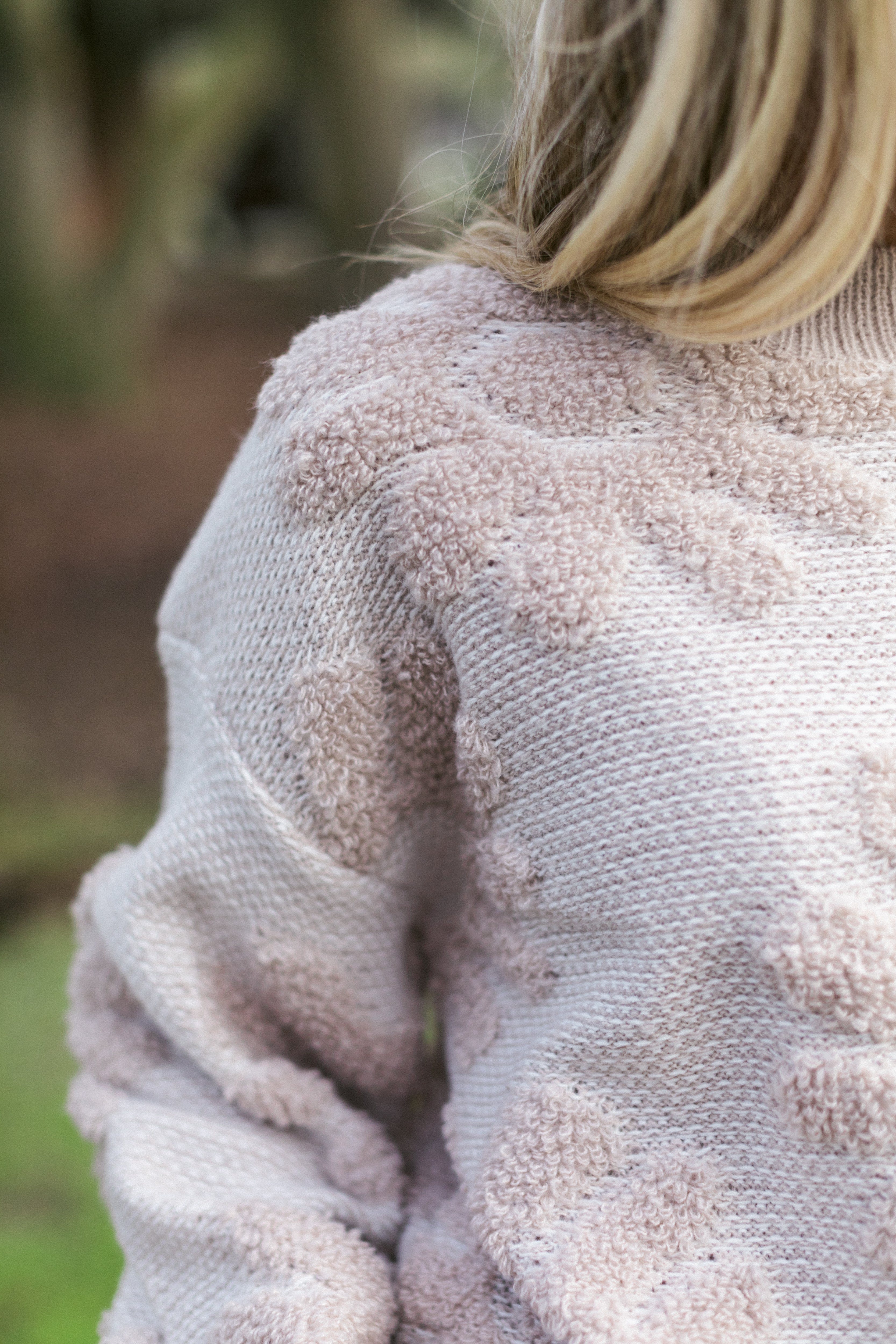 - Ribbed trim along the neckline, wrist closures and bottom hem