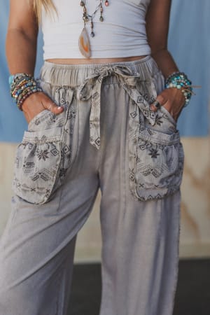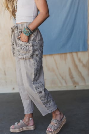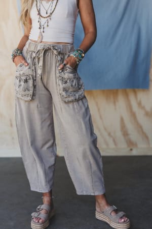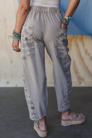 These unique patchwork pants feature a tapered leg for a chic silhouette.Β
